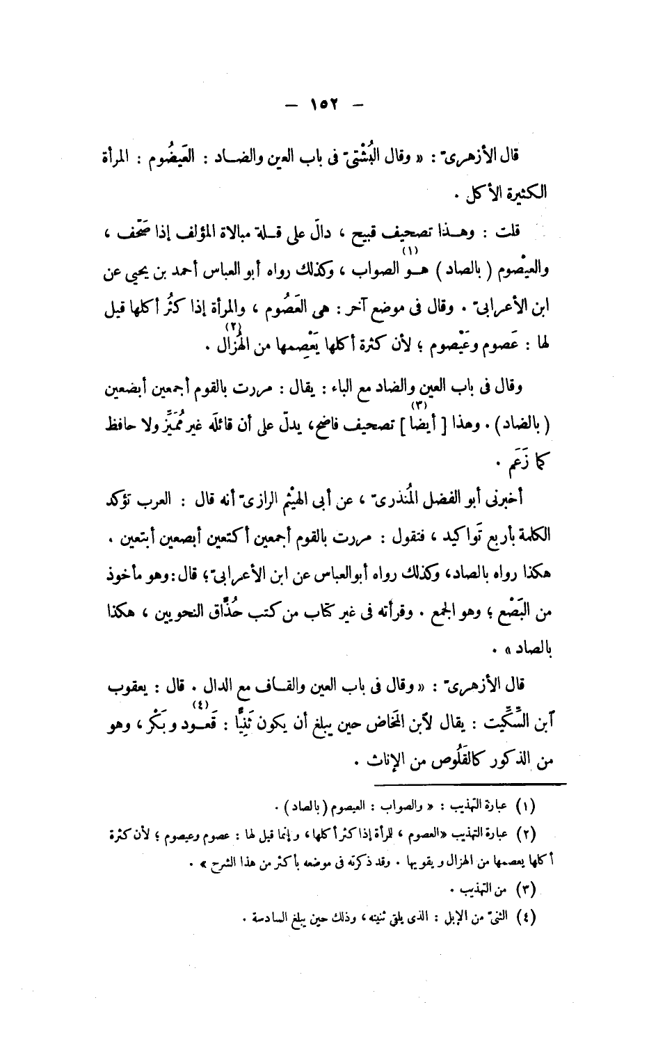 قلت: وهذا تصحيف قبيح، دالّ على قلة مبالاة المؤلف إذا صحّف، والعيصوم (بالصاد) هو «1» الصواب، وكذلك رواه أبو العباس أحمد بن يحيى عن ابن الأعرابىّ. وقال فى موضع آخر: هى العصوم، والمرأة إذا كثر أكلها قيل لها: عصوم وعيصوم؛ لأن كثرة أكلها يعصمها من الهزال «2».