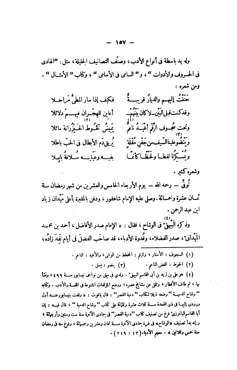 وذكره البيهقىّ «4» فى الوشاح، فقال: «الإمام صدر الأفاضل، أحمد بن محمد الميدانىّ، صدر الفضلاء، وقدوة الأدباء، قد صاحب الفضل فى أيام نفد زاده،