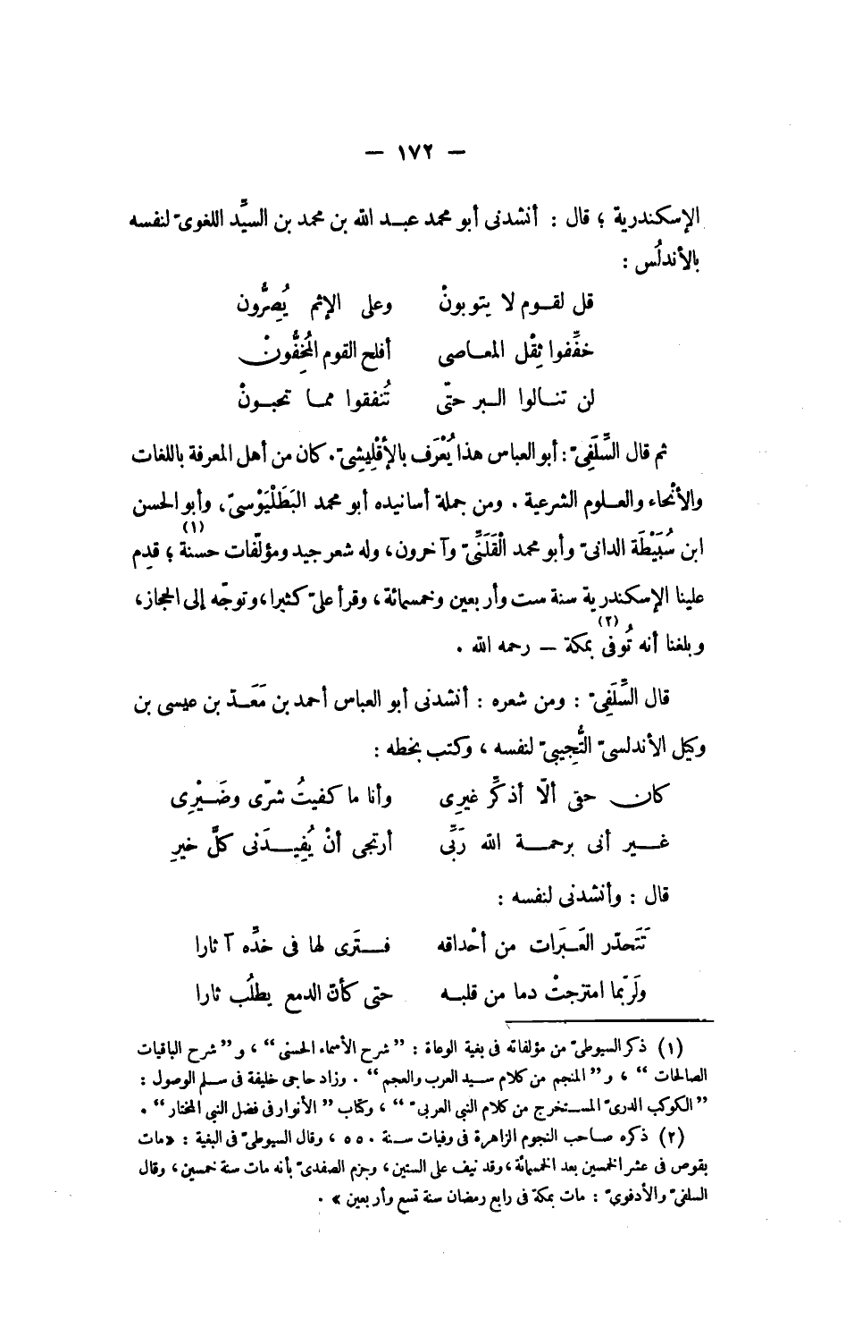 الإسكندرية؛ قال: أنشدنى أبو محمد عبد الله بن محمد بن السيّد اللغوىّ لنفسه بالأندلس: