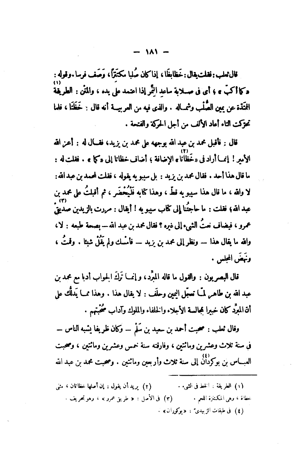لا والله، ما قال هذا سيبويه قطّ، وهذا كتابه فليحضر، ثم أقبلت على محمد بن عبد الله؛ فقلت: ما حاجتنا إلى كتاب سيبويه! أيقال: مررت بالزيدين صديقى «3» عمرو، فيضاف نعت الشىء إلى غيره؟ فقال محمد بن عبد الله- بصحة طبعه: لا، والله ما يقال هذا- ونظر إلى محمد بن يزيد- فأمسك ولم يقل شيئا. وقمت، ونهض المجلس.