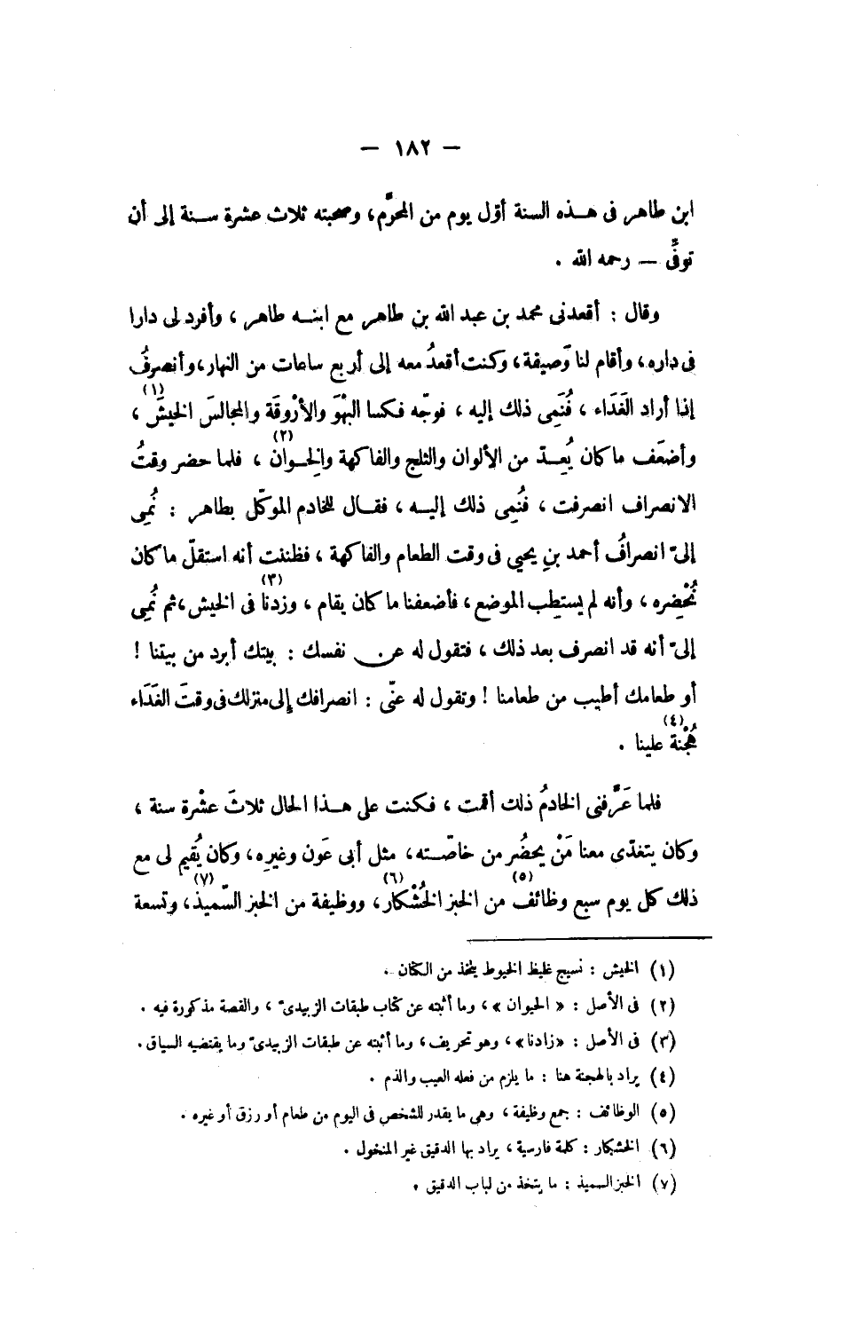 فلما عرّفنى الخادم ذلك أقمت، فكنت على هذا الحال ثلاث عشرة سنة، وكان يتغدّى معنا من يحضر من خاصّته، مثل أبى عون وغيره، وكان يقيم لى مع ذلك كل يوم سبع وظائف «5» من الخبز الخشكار «6»، ووظيفة من الخبز السّميذ «7»، وتسعة