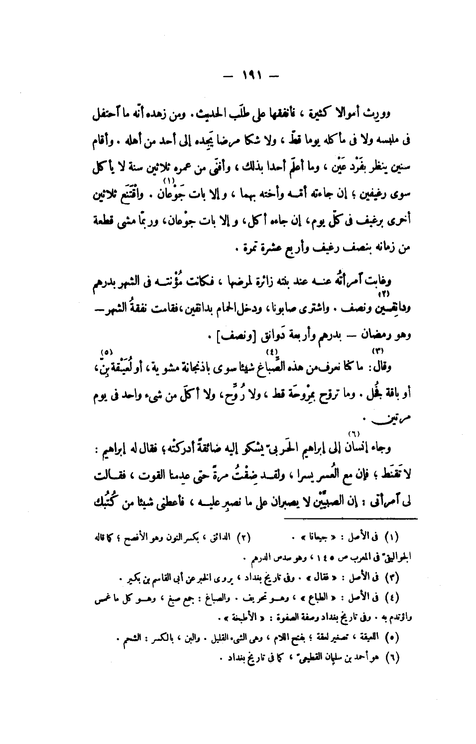 وورث أموالا كثيرة، فأنفقها على طلب الحديث. ومن زهده أنّه ما احتفل فى ملبسه ولا فى مأكله يوما قطّ، ولا شكا مرضا يجده إلى أحد من أهله. وأقام سنين ينظر بفرد عين، وما أعلم أحدا بذلك، وأفنى من عمره ثلاثين سنة لا يأكل سوى رغيفين؛ إن جاءته أمّه وأخته بهما، وإلا بات جوعان «1». واقتنع ثلاثين أخرى برغيف فى كلّ يوم، إن جاءه أكل، وإلا بات جوعان، وربّما مشى قطعة من زمانه بنصف رغيف وأربع عشرة تمرة.