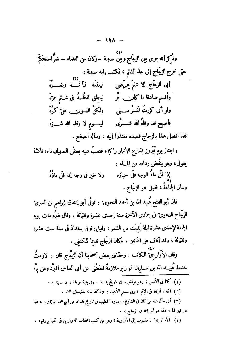 وذكر أنه جرى بين الزّجاج وبين «1» مسينة- وكان من العلماء- شرّ استحكم حتى خرج الزّجاج إلى حدّ الشتم، فكتب إليه مسينة: