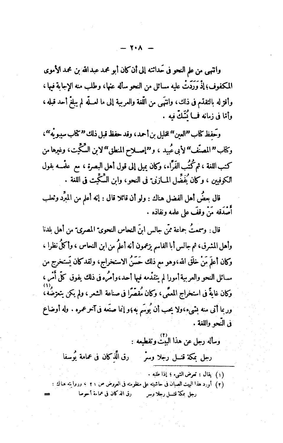 وانتهى من علم النحو فى حداثته إلى أن كان أبو محمد عبد الله بن محمد الأموى المكفوف؛ إذ وردت عليه مسائل من النحو سأله عنها، وطلب منه الإجابة فيها، وأقرّ له بالتقدّم فى ذلك، وانتهى من اللّغة والعربية إلى ما لعلّه لم يبلغ أحد قبله، وأمّا فى زمانه فما يشكّ فيه.