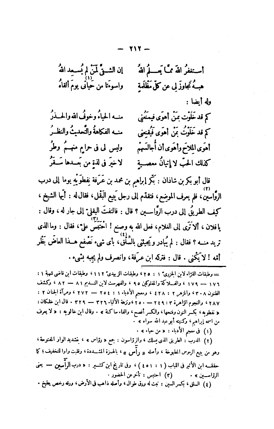 قال أبو بكر بن شاذان: بكّر إبراهيم بن محمد بن عرفة نفطويه يوما إلى درب الرّواسين، «2» فلم يعرف الموضع، فتقدّم إلى رجل يبيع البقل، فقال له: أيّها الشيخ، كيف الطريق إلى درب الرّواسين؟ قال: فالتفت البقلىّ إلى جار له، وقال: