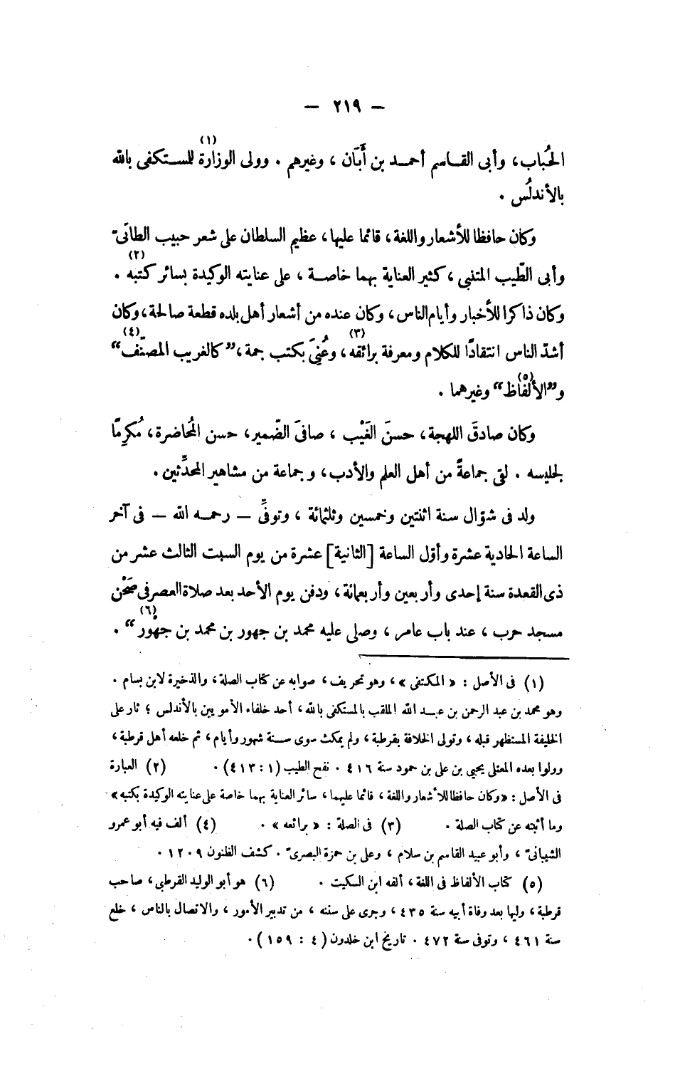 وكان ذاكرا للأخبار وأيام الناس، وكان عنده من أشعار أهل بلده قطعة صالحة، وكان أشدّ الناس انتقادا للكلام ومعرفة برائقه، «3» وعنى بكتب جمة، كالغريب المصنّف «4» والألفاظ «5» وغيرهما.