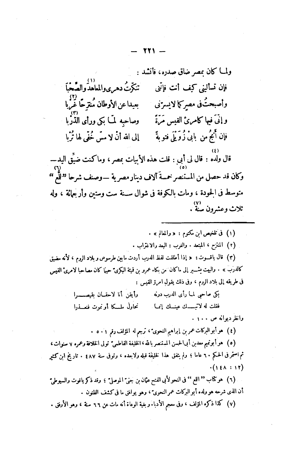 قال ولده «4»: قال لى أبى: قلت هذه الأبيات بمصر، وما كنت ضيّق اليد- وكان قد حصل من المستنصر «5» خمسة آلاف دينار مصرية- وصنف شرحا للّمع «6» متوسط فى الجودة، ومات بالكوفة فى شوال سنة ست وستين وأربعمائة، وله ثلاث وعشرون سنة «7».
