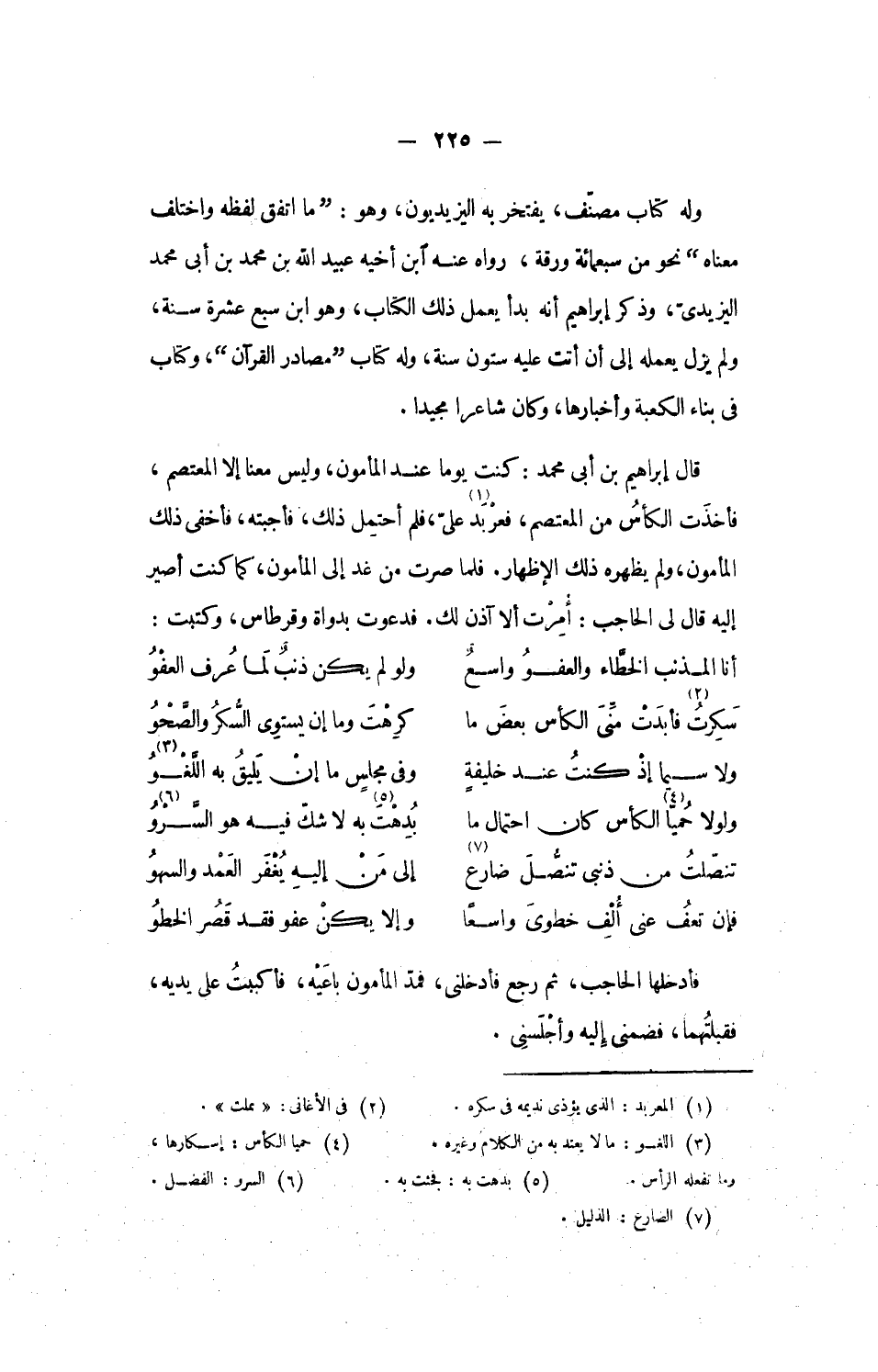 قال إبراهيم بن أبى محمد: كنت يوما عند المأمون، وليس معنا إلا المعتصم، فأخذت الكأس من المعتصم، فعربد «1» علىّ، فلم أحتمل ذلك، فأجبته، فأخفى ذلك المأمون، ولم يظهره ذلك الإظهار. فلما صرت من غد إلى المأمون، كما كنت أصير إليه قال لى الحاجب: أمرت ألا آذن لك. فدعوت بدواة وقرطاس، وكتبت: