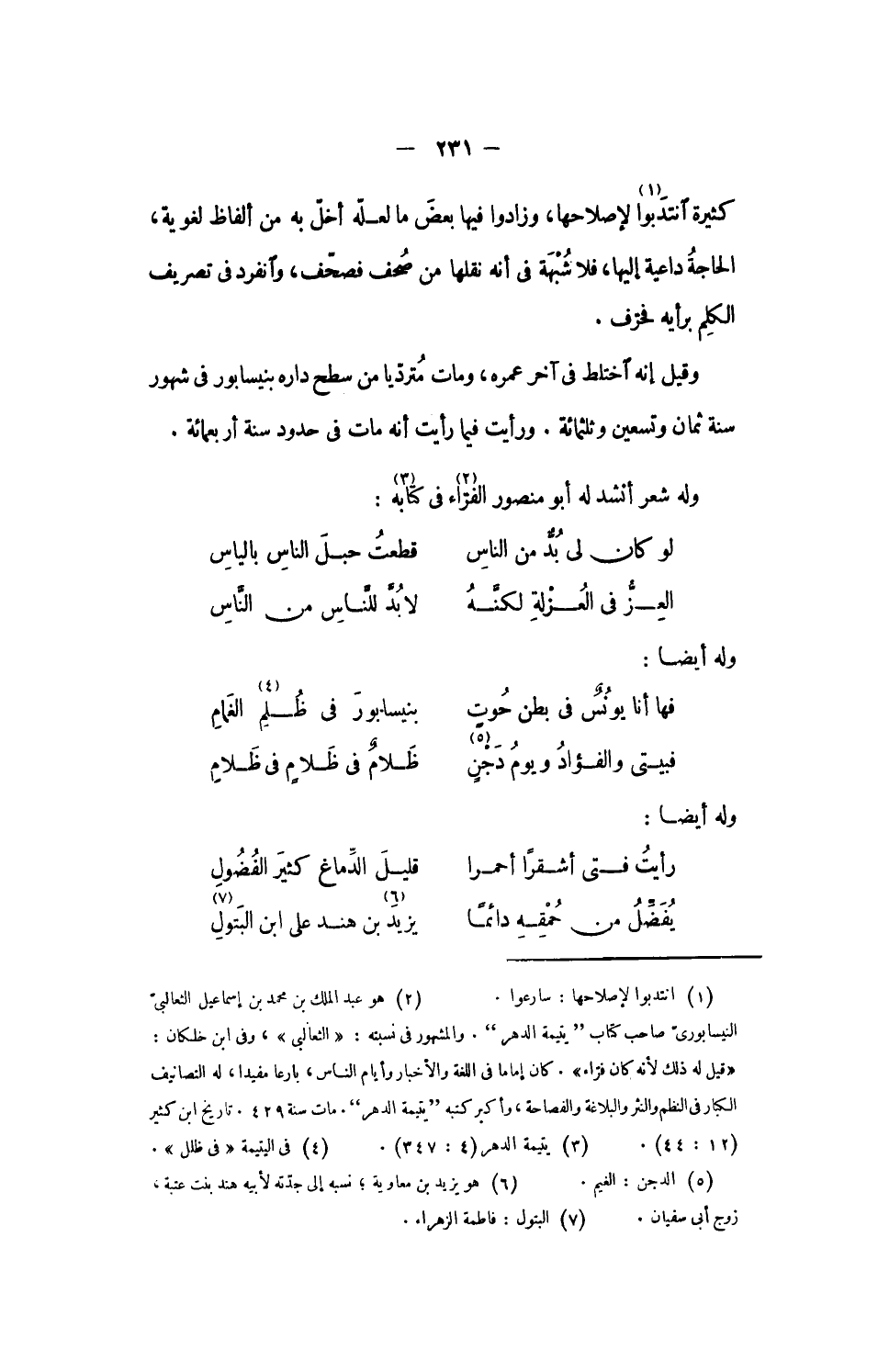 وقيل إنه اختلط فى آخر عمره، ومات متردّيا من سطح داره بنيسابور فى شهور سنة ثمان وتسعين وثلاثمائة. ورأيت فيما رأيت أنه مات فى حدود سنة أربعمائة.