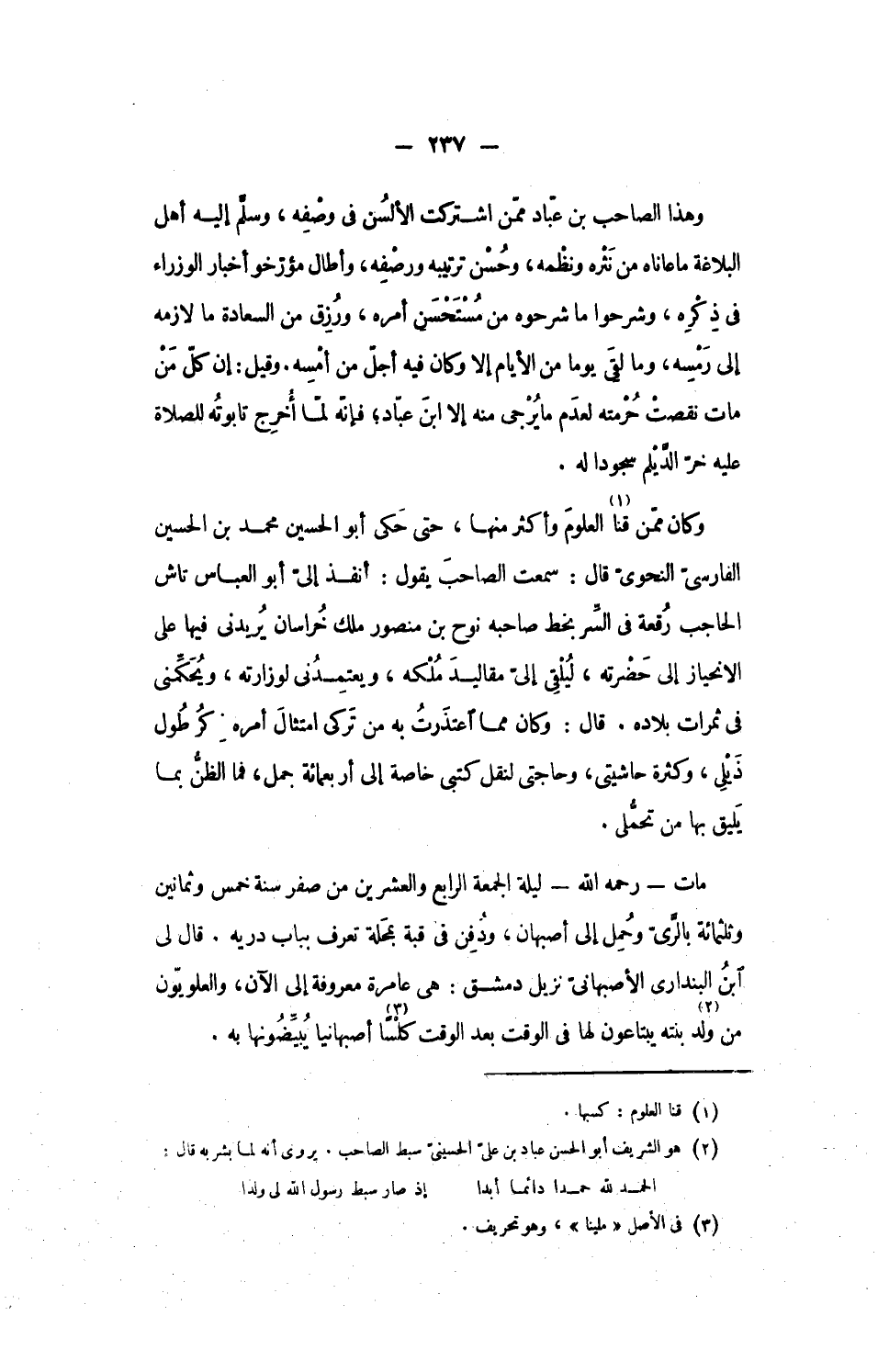 وهذا الصاحب بن عبّاد ممّن اشتركت الألسن فى وصفه، وسلّم إليه أهل البلاغة ما عاناه من نثره ونظمه، وحسن ترتيبه ورصفه، وأطال مؤرّخو أخبار الوزراء فى ذكره، وشرحوا ما شرحوه من مستحسن أمره، ورزق من السعادة ما لازمه إلى رمسه، وما لقى يوما من الأيام إلا وكان فيه أجلّ من أمسه. وقيل: إن كلّ من مات نقصت حرمته لعدم ما يرجى منه إلا ابن عبّاد؛ فإنّه لمّا أخرج تابوته للصلاة عليه خرّ الدّيلم سجودا له.