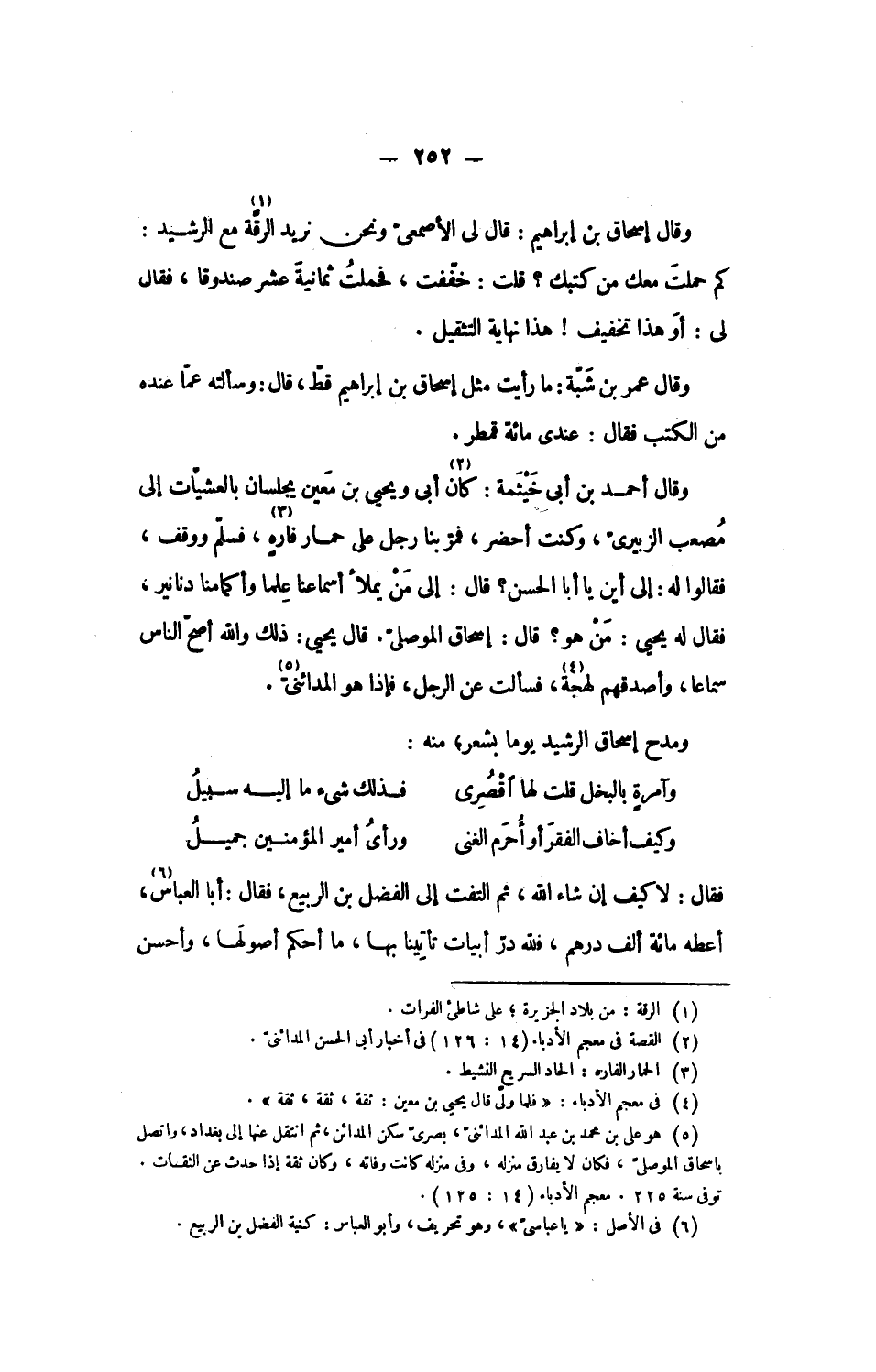 وقال أحمد بن أبى خيثمة: كان «2» أبى ويحيى بن معين يجلسان بالعشيّات إلى مصعب الزبيرىّ، وكنت أحضر، فمرّبنا رجل على حمار فاره «3»، فسلّم ووقف، فقالوا له: إلى أين يا أبا الحسن؟ قال: إلى من يملأ أسماعنا علما وأكمامنا دنانير، فقال له يحيى: من هو؟ قال: إسحاق الموصلىّ. قال يحيى: ذلك والله أصحّ الناس سماعا، وأصدقهم لهجة «4»، فسألت عن الرجل، فإذا هو المدائنىّ «5».