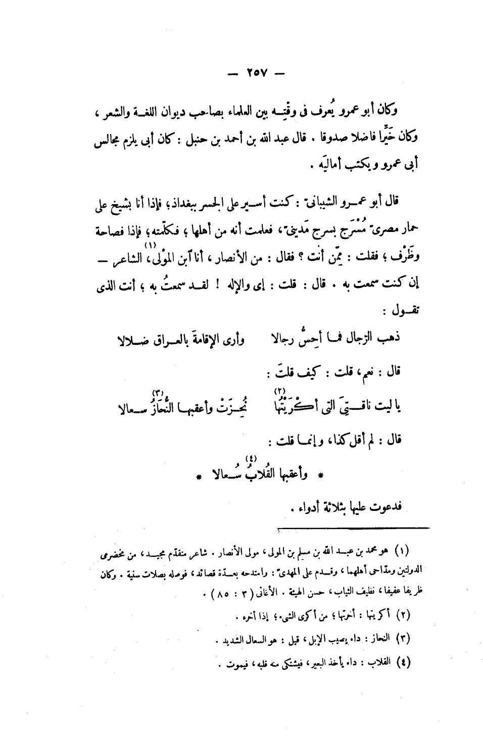 قال أبو عمرو الشيبانىّ: كنت أسير على الجسر ببغداذ؛ فإذا أنا بشيخ على حمار مصرىّ مسرج بسرج مدينىّ، فعلمت أنه من أهلها؛ فكلّمته؛ فإذا فصاحة وظرف؛ فقلت: ممّن أنت؟ فقال: من الأنصار، أنا ابن المولى، «1» الشاعر- إن كنت سمعت به. قال: قلت: إى والإله! لقد سمعت به؛ أنت الذى تقول: