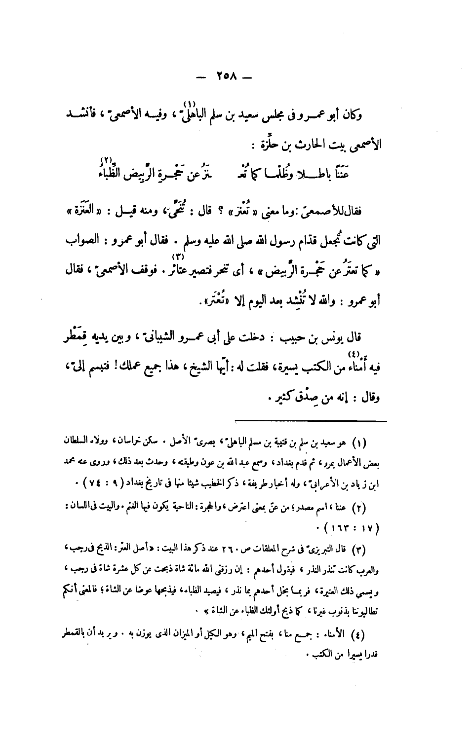 فقال للأصمعىّ: وما معنى «تعنز»؟ قال: تنحّى، ومنه قيل: «العنزة» التى كانت تجعل قدّام رسول الله صلى الله عليه وسلم. فقال أبو عمرو: الصواب «كما تعتر عن حجرة الرّبيض»، أى تنحر فتصير عتائر «3». فوقف الأصمعىّ، فقال أبو عمرو: والله لا تنشد بعد اليوم إلا «تعتر».