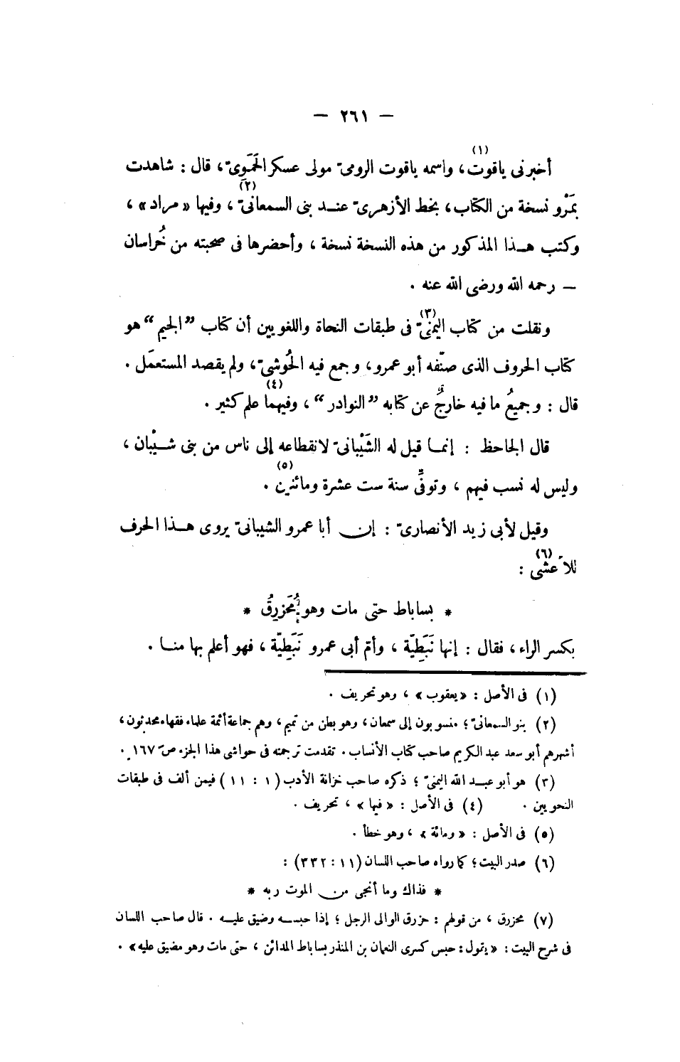 أخبرنى ياقوت «1»، واسمه ياقوت الرومىّ مولى عسكر الحموىّ، قال: شاهدت بمرو نسخة من الكتاب، بخط الأزهرىّ عند بنى السمعانىّ «2»، وفيها «مراد»، وكتب هذا المذكور من هذه النسخة نسخة، وأحضرها فى صحبته من خراسان- رحمه الله ورضى الله عنه.