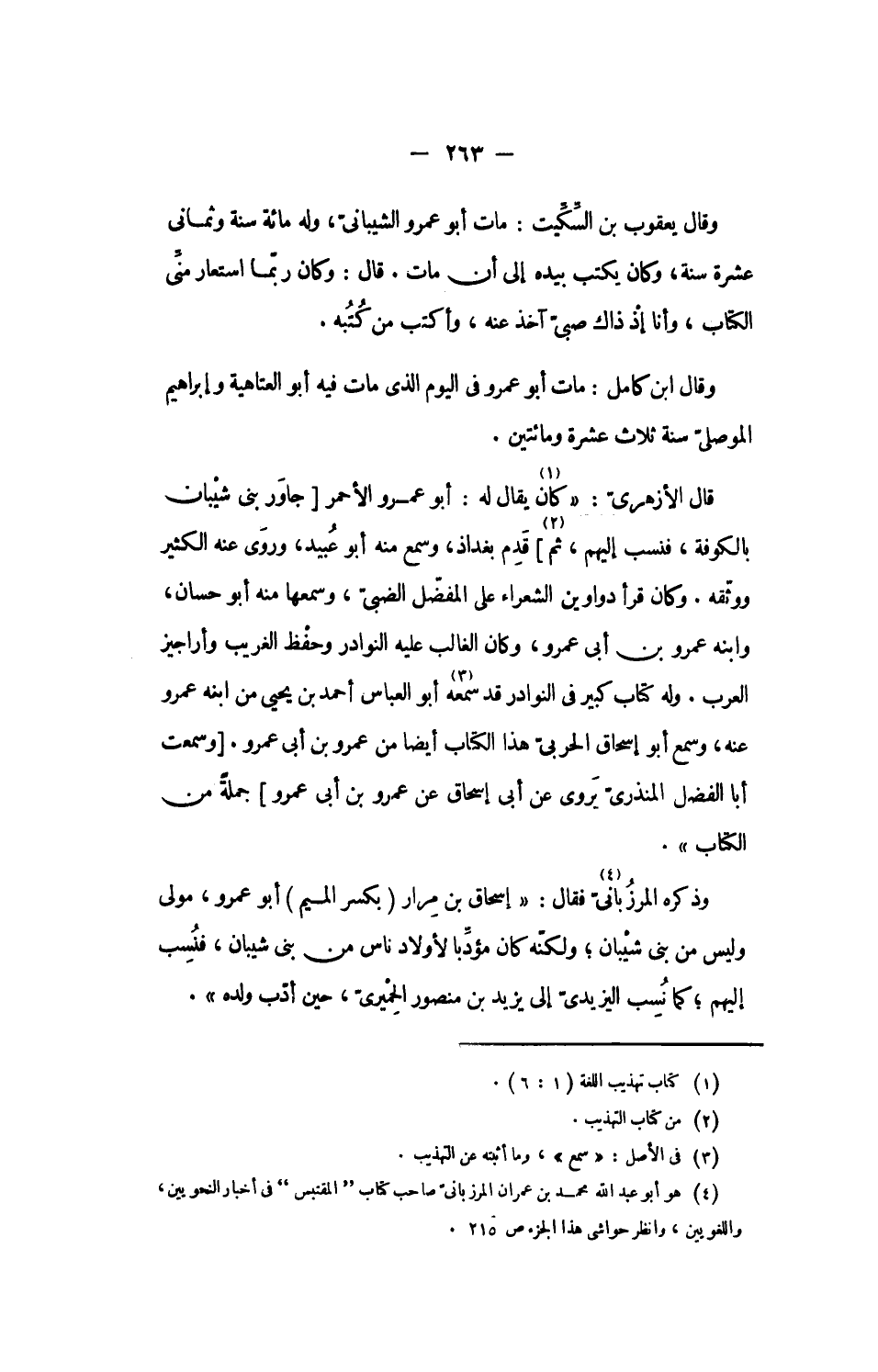 وذكره المرزبانىّ «4» فقال: «إسحاق بن مرار (بكسر الميم) أبو عمرو، مولى وليس من بنى شيبان؛ ولكنّه كان مؤدّبا لأولاد ناس من بنى شيبان، فنسب إليهم؛ كما نسب اليزيدىّ إلى يزيد بن منصور الحميرىّ، حين أدّب ولده».