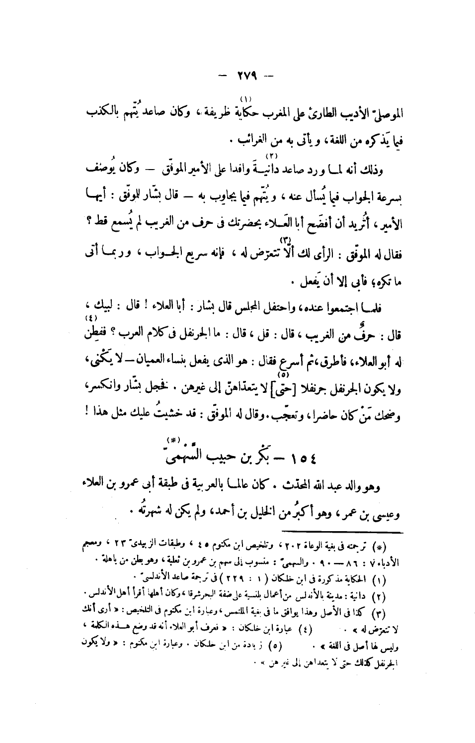 الموصلىّ الأديب الطارئ على المغرب حكاية «1» ظريفة، وكان صاعد يتّهم بالكذب فيما يذكره من اللغة، ويأتى به من الغرائب.