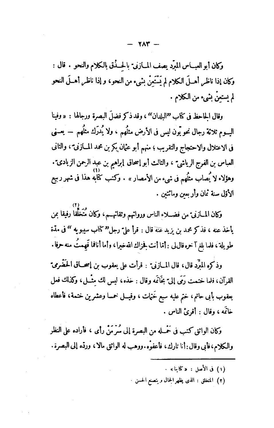 وكان المازنىّ من فضلاء الناس ورواتهم وثقاتهم، وكان متخلّقا «2» رفيقا بمن يأخذ عنه، فذكر محمد بن يزيد عنه قال: قرأ علىّ رجل كتاب سيبويه فى مدّة طويلة، فلما بلغ آخره قال لى: أمّا أنت فجزاك الله خيرا، وأما أنا فما فهمت منه حرفا.