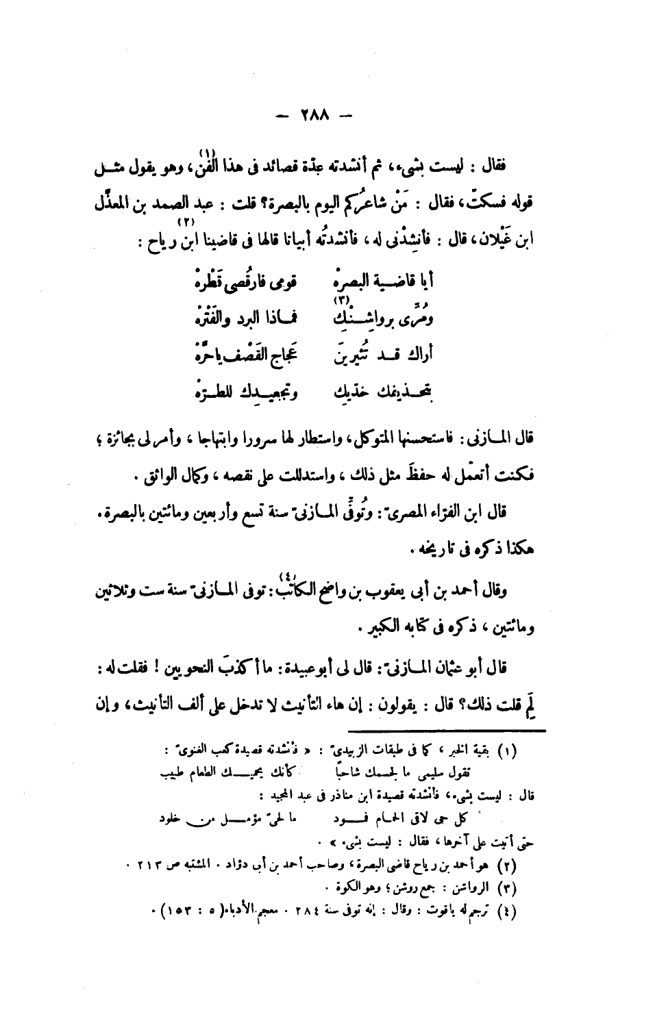 وقال أحمد بن أبى يعقوب بن واضح الكاتب «4»: توفى المازنىّ سنة ست وثلاثين ومائتين، ذكره فى كتابه الكبير.