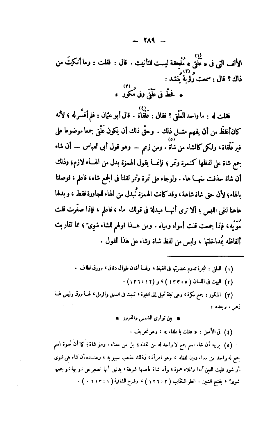 فقلت له: ما واحد العلقى؟ فقال: علقاة «4». قال أبو عثمان: فلم أفسّر له؛ لأنه كان أغلظ من أن يفهم مثل ذلك. وحقّ ذلك أن يكون علقى جمعا موضوعا على غير علقاة، ولكن كالشاء من شاة «5». ومن زعم- وهو قول أبى العباس- أن شاء جمع شاة على لفظها كتمرة وتمر؛ فإنما يقول الهمزة بدل من الهاء لازم؛ وذلك أن شاة حذفت منها هاء. ولو جاء على تمرة وتمر لقلنا فى الجمع شاه، فاعلم، فوصلنا بالهاء؛ لأن حق شاة شاهة، وقد كانت الهمزة تبدل من الهاء للمجاورة فقط، وبدلها هاهنا لنفى اللبس؛ ألا ترى أنها مبدلة فى قولك ماء، فاعلم، فإذا صغّرت قلت مويه، فإذا جمعت قلت أمواه ومياه. ومن هذا قولهم للشاء شوىّ؛ مما تقاربت ألفاظه بمداخلتها، وليس من لفظ شاة وشاء على هذا القول.