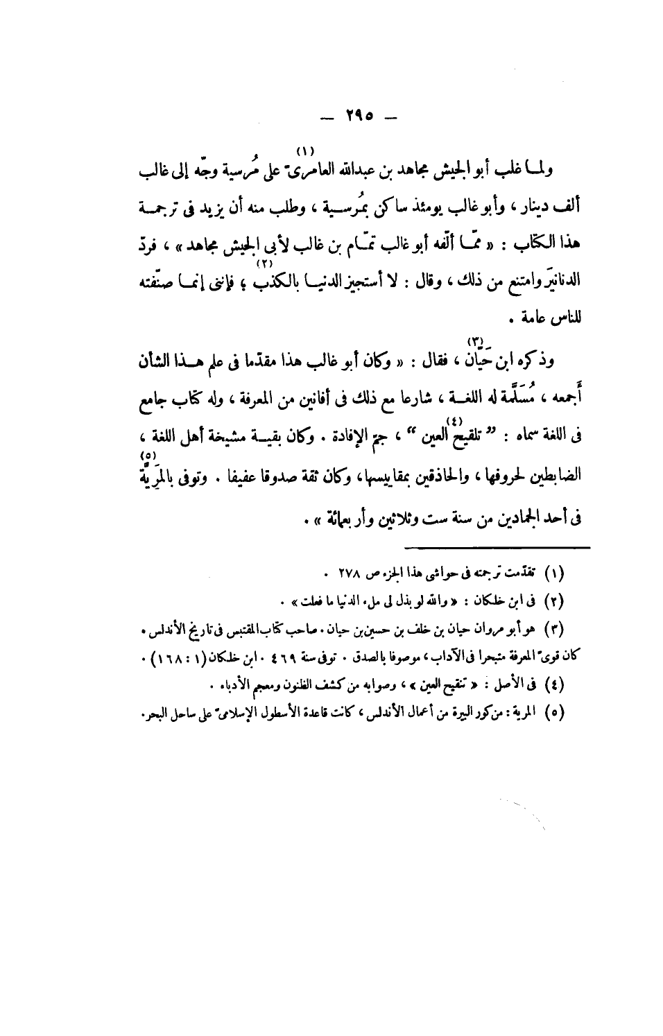 وذكره ابن حيّان «3»، فقال: «وكان أبو غالب هذا مقدّما فى علم هذا الشأن أجمعه، مسلّمة له اللغة، شارعا مع ذلك فى أفانين من المعرفة، وله كتاب جامع فى اللغة سماه: تلقيح «4» العين، جمّ الإفادة. وكان بقية مشيخة أهل اللغة، الضابطين لحروفها، والحاذقين بمقاييسها، وكان ثقة صدوقا عفيفا. وتوفى بالمريّة «5» فى أحد الجمادين من سنة ست وثلاثين وأربعمائة».