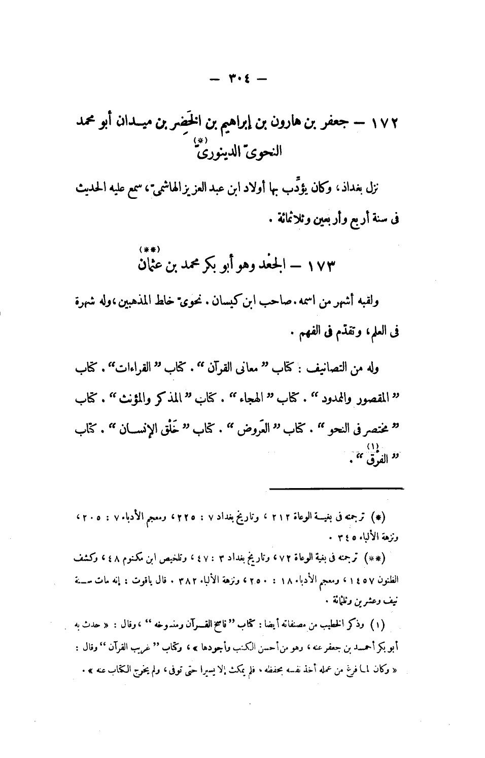 [2] ترجمته فى بغية الوعاة 72، وتاريخ بغداد 3: 47، وتلخيص ابن مكتوم 48، وكشف الظنون 1457، ومعجم الأدباء 18: 250، ونزهة الألباء 382. قال ياقوت: إنه مات سنة نيف وعشرين وثلاثمائة.