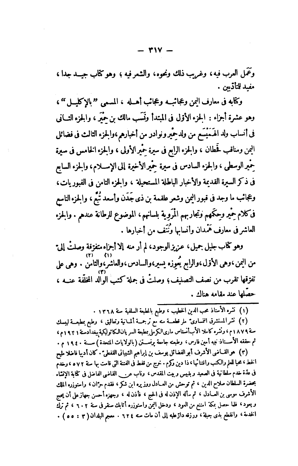 وكتابه فى معارف اليمن وعجائبه وعجائب أهله، المسمى بالإكليل، وهو عشرة أجزاء: الجزء الأوّل فى المبتدأ ونسب مالك بن حمير، والجزء الثانى فى أنساب ولد الهميسع من ولد حمير ونوادر من أخبارهم، والجزء الثالث فى فضائل اليمن ومناقب قحطان، والجزء الرابع فى سيرة حمير الأولى، والجزء الخامس فى سيرة حمير الوسطى، والجزء السادس فى سيرة حمير الأخيرة إلى الإسلام، والجزء السابع فى ذكر السيرة القديمة والأخبار الباطلة المستحيلة، والجزء الثامن فى القبوريات، وعجائب ما وجد فى قبور اليمن وشعر علقمة بن ذى جدن وأسعد تبّع، والجزء التاسع فى كلام حمير وحكمهم وتجاربهم المروية بلسانهم، الموضوع للرطانة عندهم. والجزء العاشر فى معارف همدان وأنسابها ونتف من أخبارها.