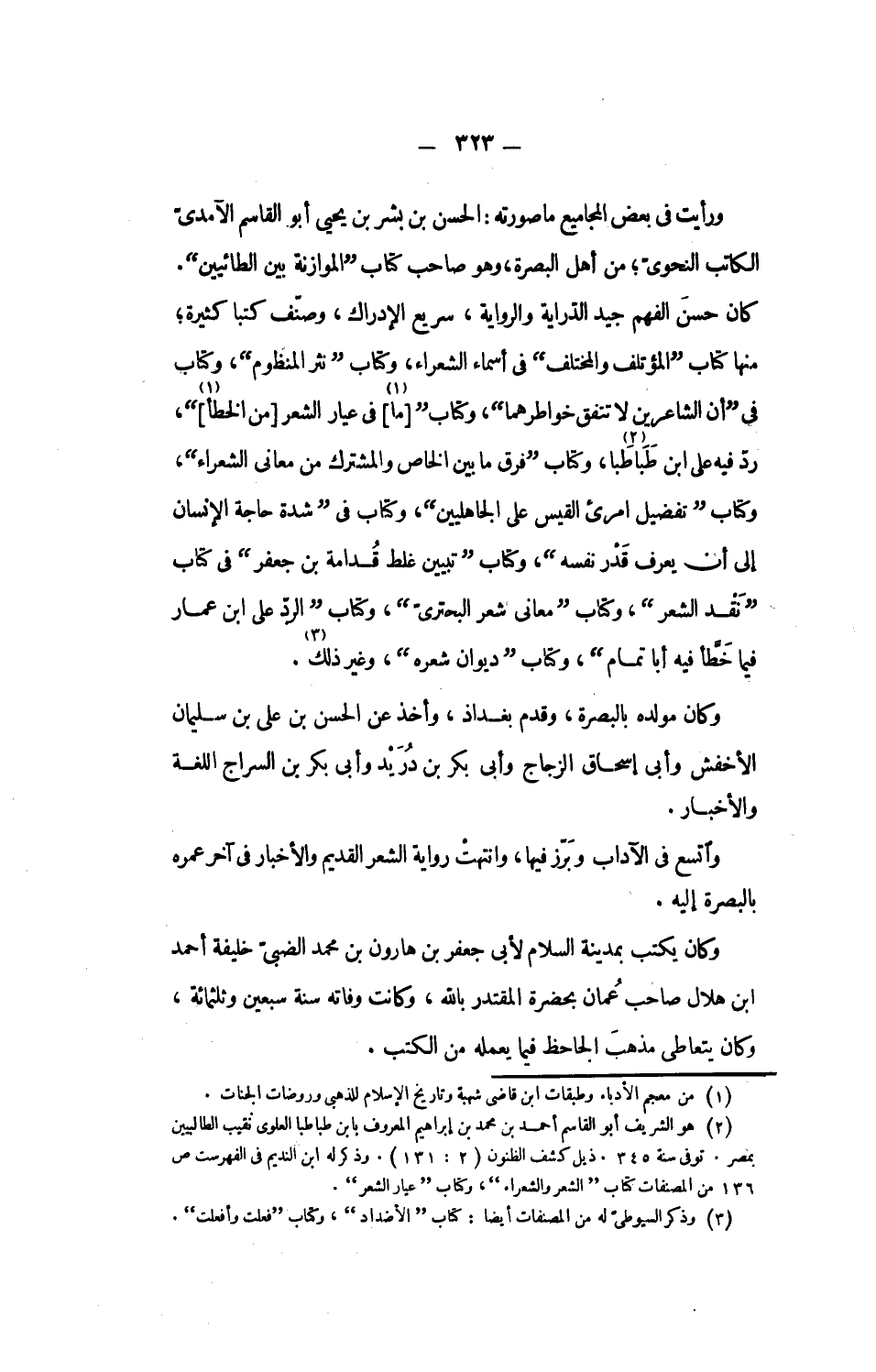 ورأيت فى بعض المجاميع ما صورته: الحسن بن بشر بن يحيى أبو القاسم الآمدىّ الكاتب النحوىّ؛ من أهل البصرة، وهو صاحب كتاب الموازنة بين الطائيين.