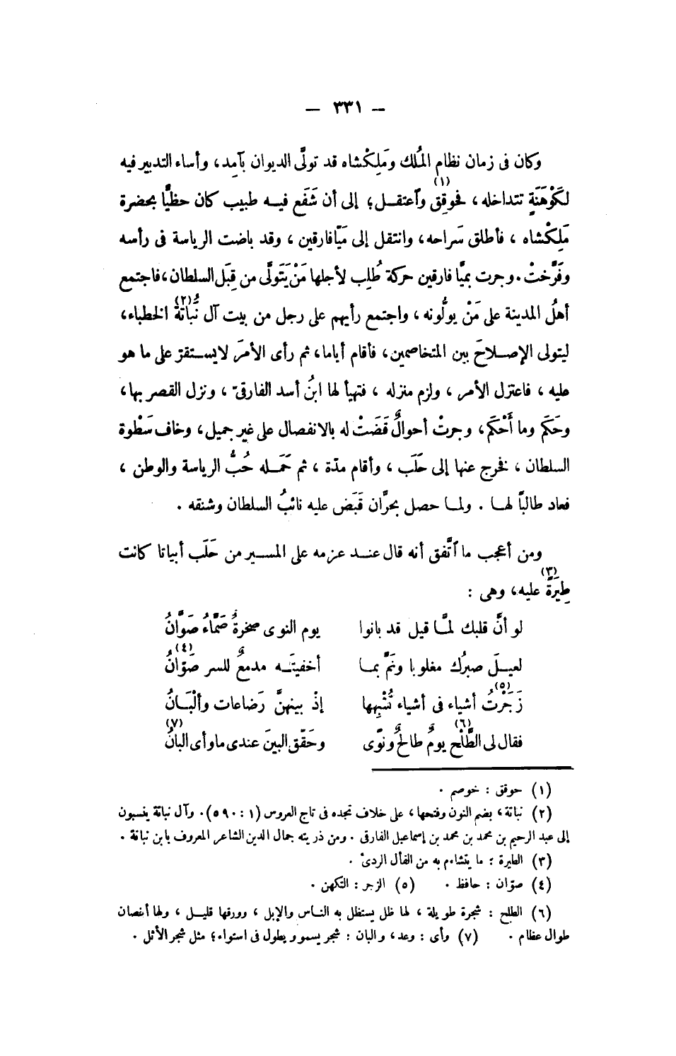 ومن أعجب ما اتّفق أنه قال عند عزمه على المسير من حلب أبياتا كانت طيرة «3» عليه، وهى: