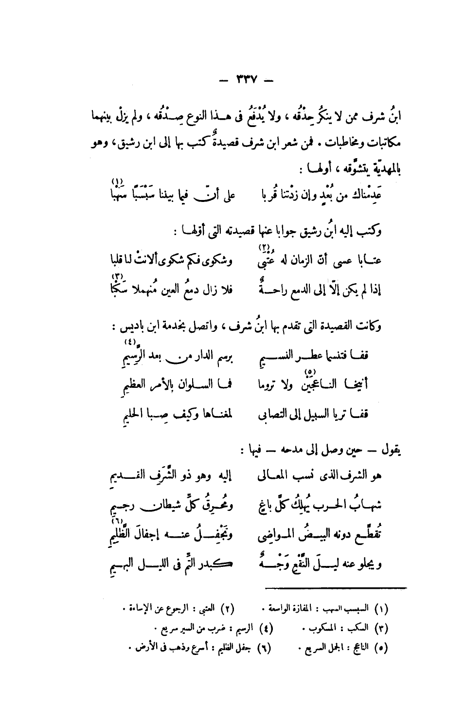 ابن شرف ممن لا ينكر حدقه، ولا يدفع فى هذا النوع صدقه، ولم يزل بينهما مكاتبات ومخاطبات. فمن شعر ابن شرف قصيدة كتب بها إلى ابن رشيق، وهو بالمهديّة يتشوّقه، أولها: