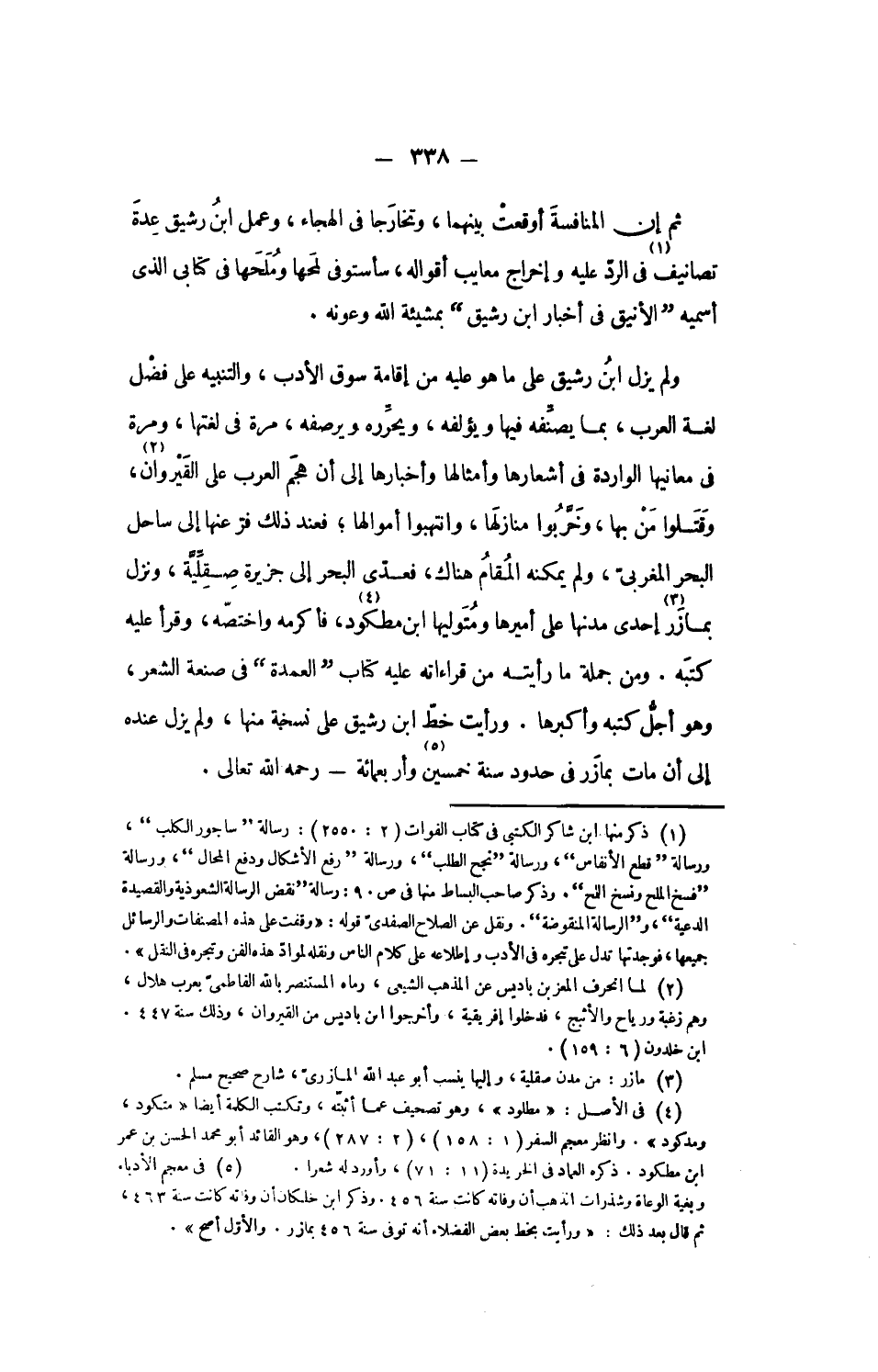 ولم يزل ابن رشيق على ما هو عليه من إقامة سوق الأدب، والتنبيه على فضل لغة العرب، بما يصنّفه فيها ويؤلفه، ويحرّره ويرصفه، مرة فى لغتها، ومرة فى معانيها الواردة فى أشعارها وأمثالها وأخبارها إلى أن هجم العرب على القيروان «2»، وقتلوا من بها، وخرّبوا منازلها، وانتهبوا أموالها؛ فعند ذلك فرّ عنها إلى ساحل البحر المغربىّ، ولم يمكنه المقام هناك، فعدّى البحر إلى جزيرة صقلّيّة، ونزل بمازر «3» إحدى مدنها على أميرها ومتوليها ابن مطكود «4»، فأكرمه واختصّه، وقرأ عليه كتبه. ومن جملة ما رأيته من قراءاته عليه كتاب العمدة فى صنعة الشعر، وهو أجلّ كتبه وأكبرها. ورأيت خطّ ابن رشيق على نسخة منها، ولم يزل عنده إلى أن مات بمازر فى حدود سنة خمسين «5» وأربعمائة- رحمه الله تعالى.