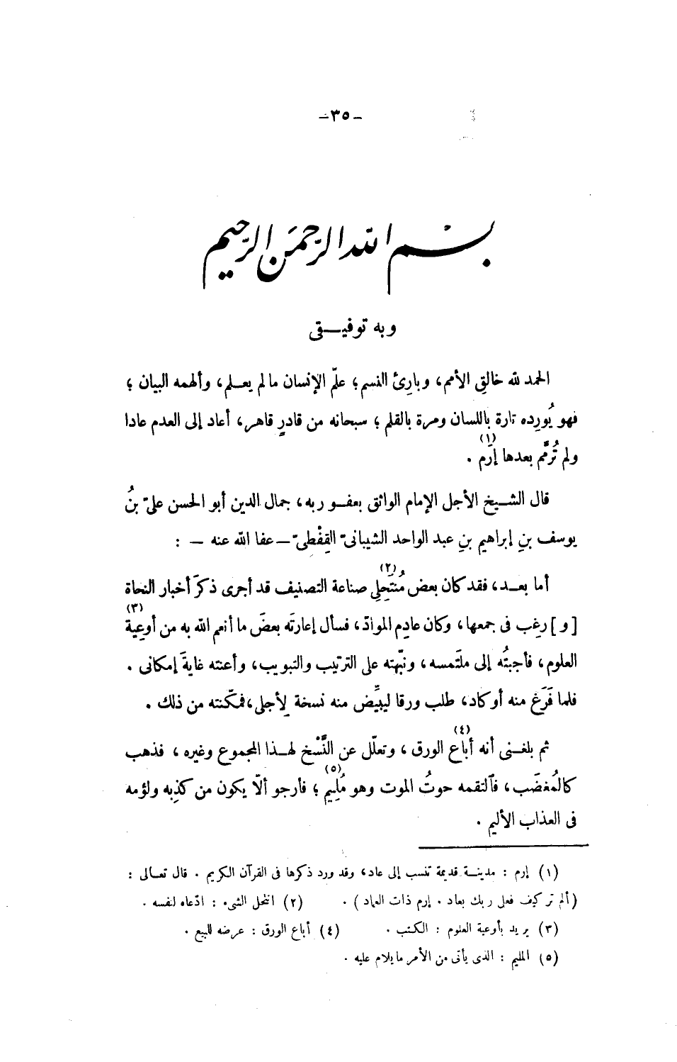 قال الشيخ الأجل الإمام الواثق بعفو ربه، جمال الدين أبو الحسن علىّ بن يوسف بن إبراهيم بن عبد الواحد الشيبانىّ القفطىّ- عفا الله عنه-: