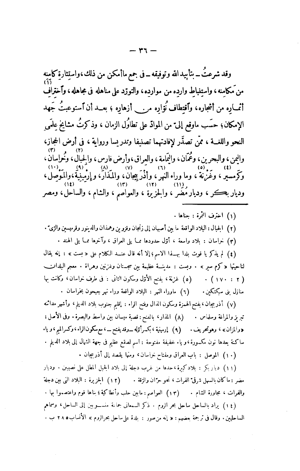 وقد شرعت- بتأييد الله وتوفيقه- فى جمع ما أمكن من ذلك، واستثارة كامنه من مكامنه، واستنباط وارده من موارده، والتورّد على مناهله فى مجاهله، واختراف «1» أثماره من أشجاره، واقتطاف نوّاره من أزهاره؛ بعد أن استوعبت جهد الإمكان؛ حسب ما وقع إلىّ من الموادّ على تطاول الزمان، وذكرت مشايخ علمى النحو واللغة، ممّن تصدّر لإفادتهما تصنيفا وتدريسا ورواية، فى أرض الحجاز، واليمن، والبحرين، وعمان، واليمامة، والعراق، وأرض فارس، والجبال «2»، وخراسان «3»، وكرمسير «4»، وغزنة «5»، وما وراء النهر «6»، وأذربيجان «7»، والمذار «8»، وإرمينية «9»، والموصل «10»، وديار بكر، وديار مضر «11»، والجزيرة «12»، والعواصم «13»، والشام، والساحل «14»، ومصر