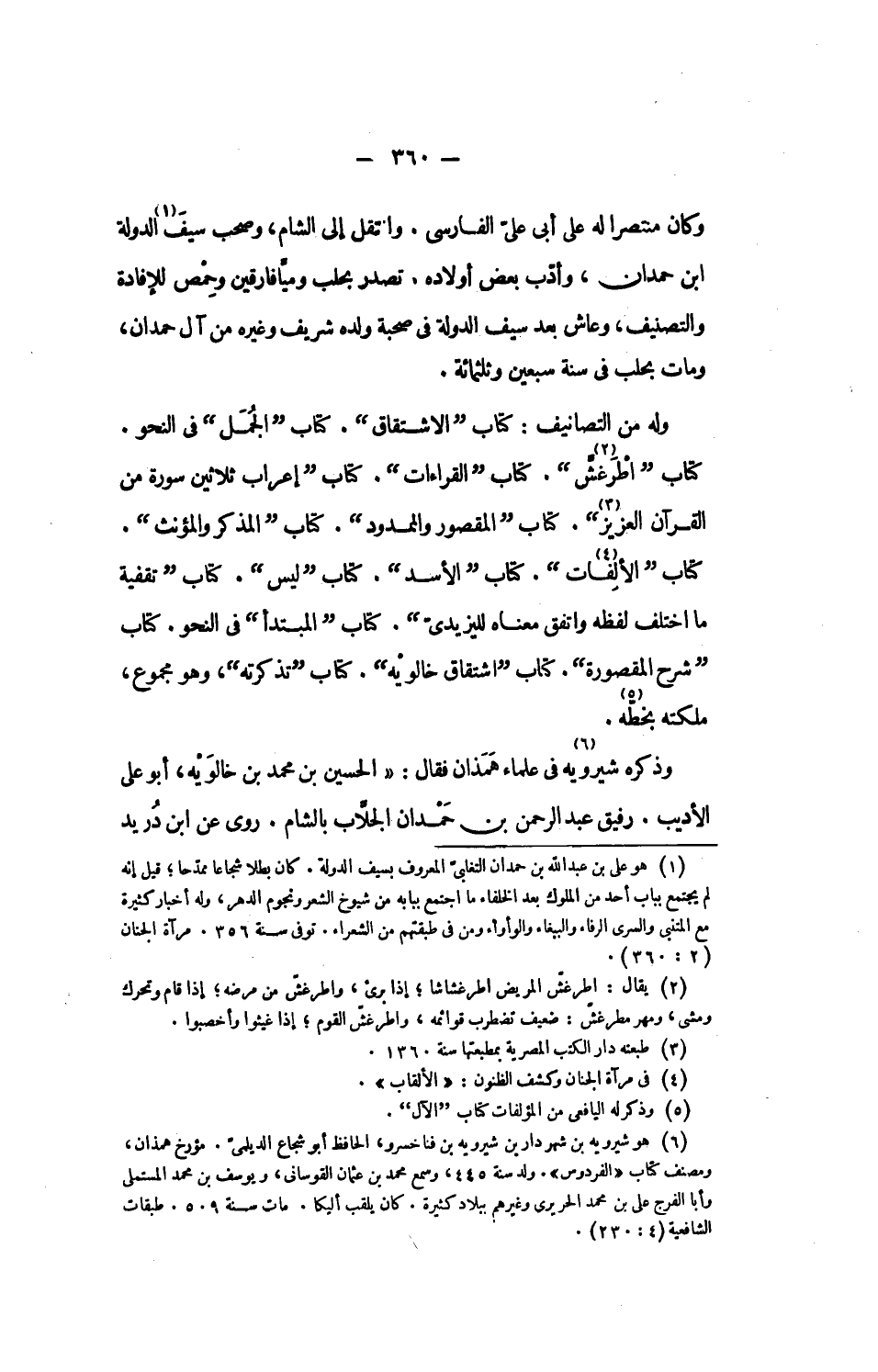 وكان منتصرا له على أبى علىّ الفارسى. وانتقل إلى الشام، وصحب سيف «1» الدولة ابن حمدان، وأدّب بعض أولاده وتصدر بحلب وميّافارقين وحمص للإفادة والتصنيف، وعاش بعد سيف الدولة فى صحبة ولده شريف وغيره من آل حمدان، ومات بحلب فى سنة سبعين وثلاثمائة.