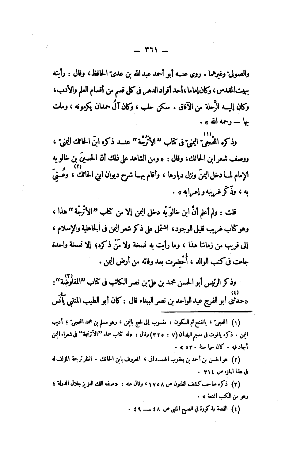 قلت: ولم أعلم أنّ ابن خالويه دخل اليمن إلا من كتاب الأترجّة هذا، وهو كتاب غريب قليل الوجود، اشتمل على ذكر شعر اليمن فى الجاهلية والإسلام، إلى قريب من زماننا هذا، وما رأيت به نسخة ولا من ذكره؛ إلا نسخة واحدة جاءت فى كتب الوالد، أحضرت بعد وفاته من أرض اليمن.