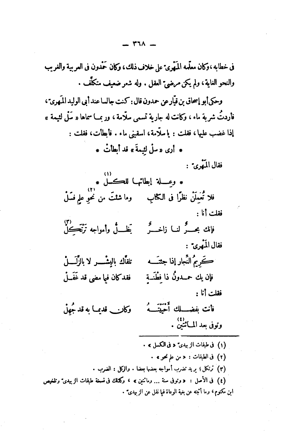 فى خطابه، وكان معلّمه المهرىّ على خلاف ذلك، وكان حمدون فى العربية والغريب والنحو الغاية، ولم يكن مرضىّ العقل. وله شعر ضعيف متكلّف.