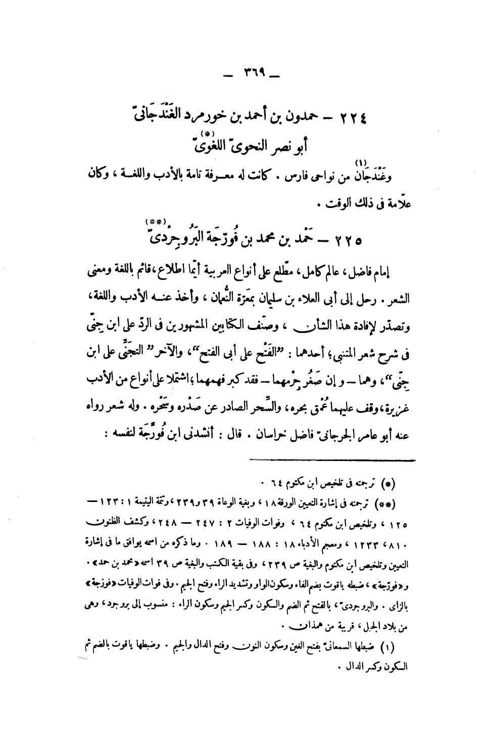 و «فورّجة»، ضبطه ياقوت بضم الفاء وسكون الواو وتشديد الراء وفتح الجيم. وفى فوات الوفيات «فوزجة» بالزاى. والبروجردىّ، بالفتح ثم الضم والسكون وكسر الجيم وسكون الراء: منسوب إلى بروجرد، وهى من بلاد الجبل، قريبة من همذان.