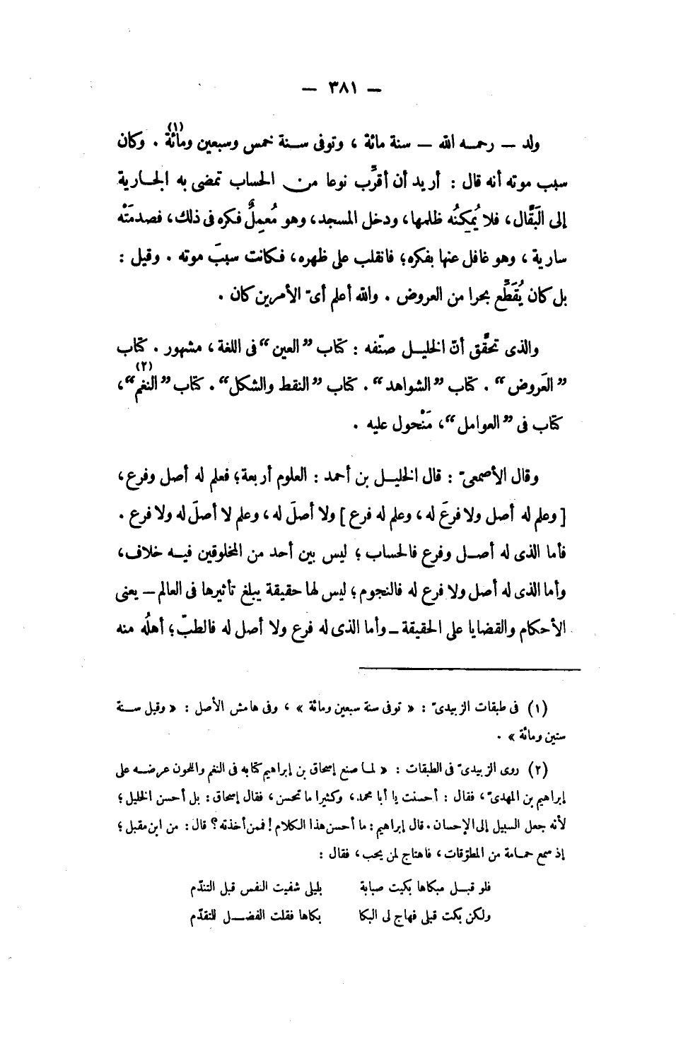 ولد- رحمه الله- سنة مائة، وتوفى سنة خمس وسبعين ومائة «1». وكان سبب موته أنه قال: أريد أن أقرّب نوعا من الحساب تمضى به الجارية إلى البقّال، فلا يمكنه ظلمها، ودخل المسجد، وهو معمل فكره فى ذلك، فصدمته سارية، وهو غافل عنها بفكره؛ فانقلب على ظهره، فكانت سبب موته. وقيل:
