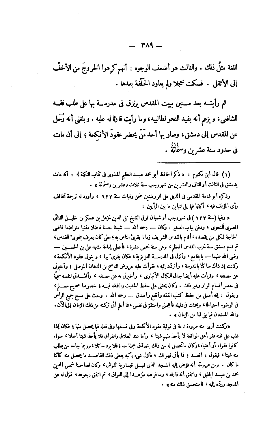 ثم رأيته بعد سنين ببيت المقدس يرتزق فى مدرسة بها على طلب فقه الشافعى، ويزعم أنه يفيد النحو لطالبيه، وما رأيت قارئا له عليه. وبلغنى أنه رحل عن المقدس إلى دمشق، وصار بها أحد من يحضر عقود الأنكحة؛ إلى أن مات فى حدود سنة عشرين وستمائة «1».