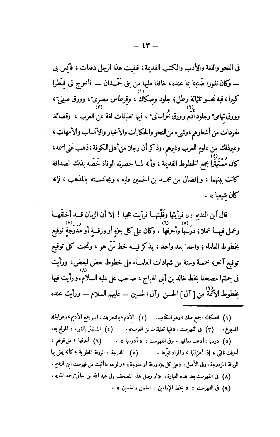 قال ابن النديم: «فرأيتها وقلّبتها فرأيت عجبا! إلا أن الزمان قد أخلقها وعمل فيها عملا؛ درسها «5» وأحرفها «6». وكان على كل جزء أو ورقة أو مدرجة «7» توقيع بخطوط العلماء؛ واحدا بعد واحد، يذكر فيه خط من هو، وتحت كل توقيع توقيع آخر، خمسة وستة من شهادات العلماء على خطوط بعض لبعض، ورأيت فى جملتها مصحفا بخط خالد بن أبى الهياج، صاحب على عليه السلام «8». ورأيت فيها بخطوط الأئمة «9» من [آل] الحسن وآل الحسين- عليهم السلام- ورأيت عنده