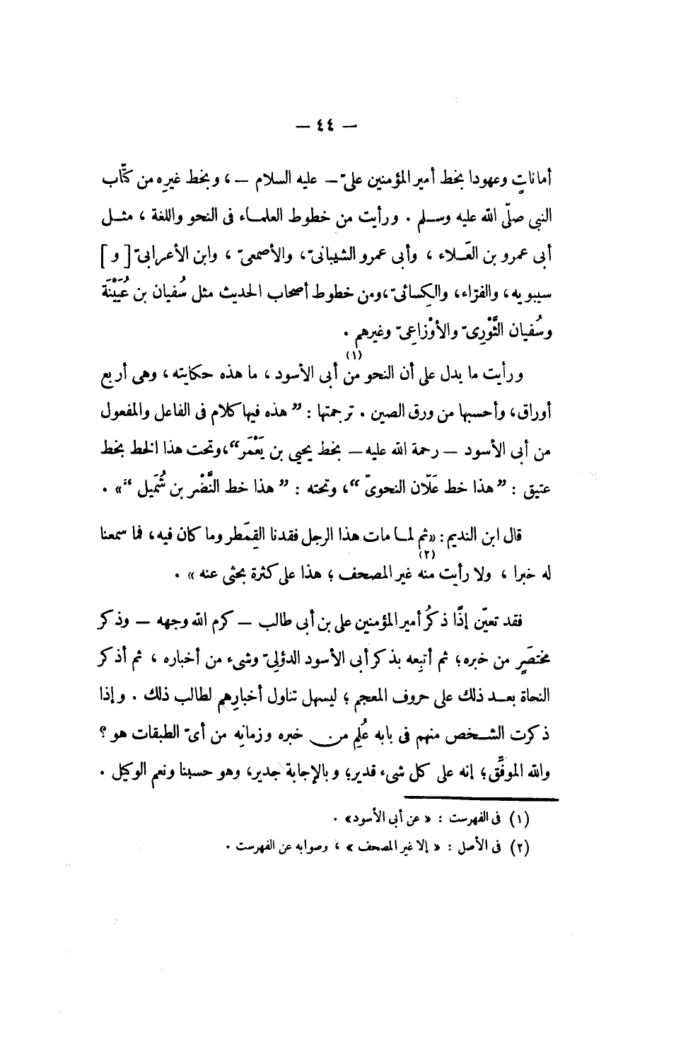 ورأيت ما يدل على أن النحو من «1» من أبى الأسود، ما هذه حكايته، وهى أربع أوراق، وأحسبها من ورق الصين. ترجمتها: هذه فيها كلام فى الفاعل والمفعول من أبى الأسود- رحمة الله عليه- بخط يحيى بن يعمر، وتحت هذا الخط بخط عتيق: هذا خط علّان النحوىّ، وتحته: هذا خط النّضر بن شميل».