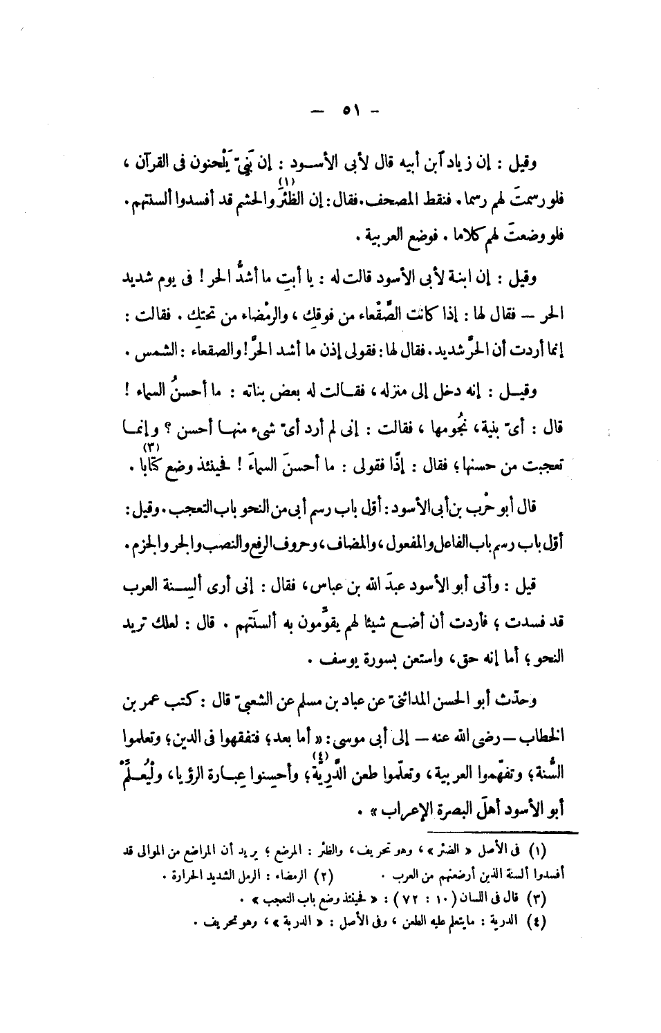 وقيل: إن زياد ابن أبيه قال لأبى الأسود: إن بنىّ يلحنون فى القرآن، فلو رسمت لهم رسما. فنقط المصحف. فقال: إن الظئر «1» والحشم قد أفسدوا ألسنتهم.