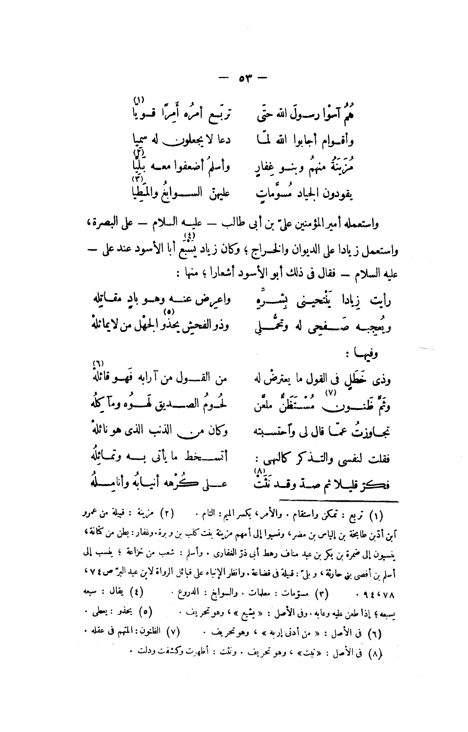 واستعمله أمير المؤمنين علىّ بن أبى طالب- عليه السلام- على البصر واستعمل زيادا على الديوان والخراج؛ وكان زياد يسبع «4» أبا الأسود عند على- عليه السلام- فقال فى ذلك أبو الأسود أشعارا؛ منها:
