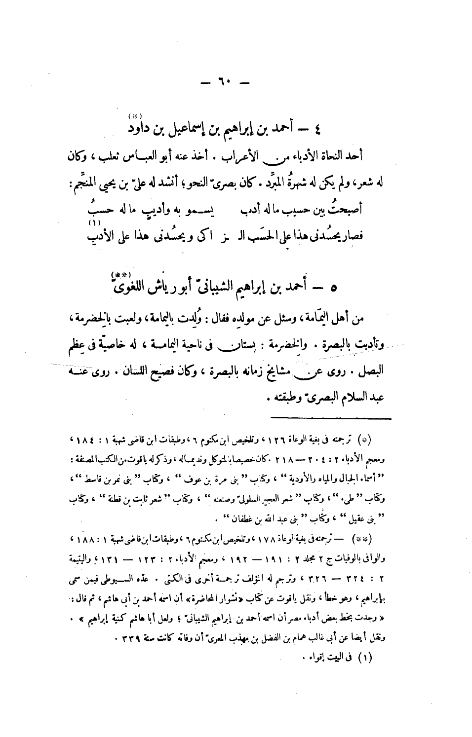 [2] ترجمته فى بغية الوعاة 178، وتلخيص ابن مكتوم 6، وطبقات ابن قاضى شهبة 1: 188، والوافى بالوفيات ج 2 مجلد 2: 191 - 192، ومعجم الأدباء 2: 123 - 131، واليتيمة 2: 324 - 326، وترجم له المؤلف ترجمة أخرى فى الكنى. عدّه السيوطى فيمن سمى بإبراهيم، وهو خطأ، ونقل ياقوت عن كتاب «نشوار المحاضرة» أن اسمه أحمد بن أبى هاشم، ثم قال: