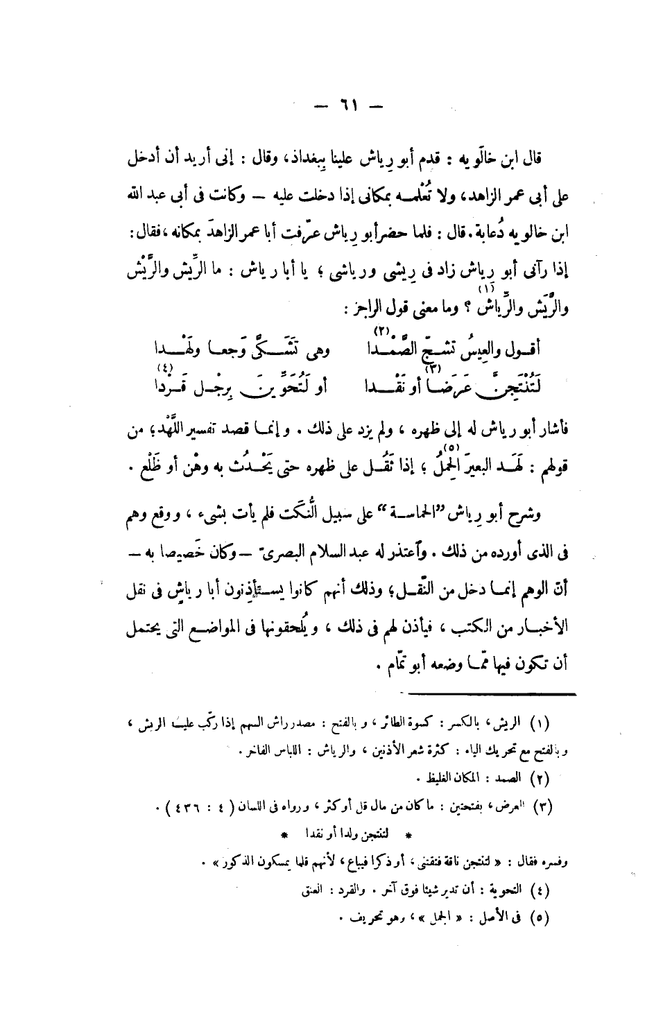 وشرح أبو رياش الحماسة على سبيل النّكت فلم يأت بشىء، ووقع وهم فى الذى أورده من ذلك. واعتذر له عبد السلام البصرىّ- وكان خصيصا به- أنّ الوهم إنما دخل من النّقل؛ وذلك أنهم كانوا يستأذنون أبا رياش فى نقل الأخبار من الكتب، فيأذن لهم فى ذلك، ويلحقونها فى المواضع التى يحتمل أن تكون فيها ممّا وضعه أبو تمّام.