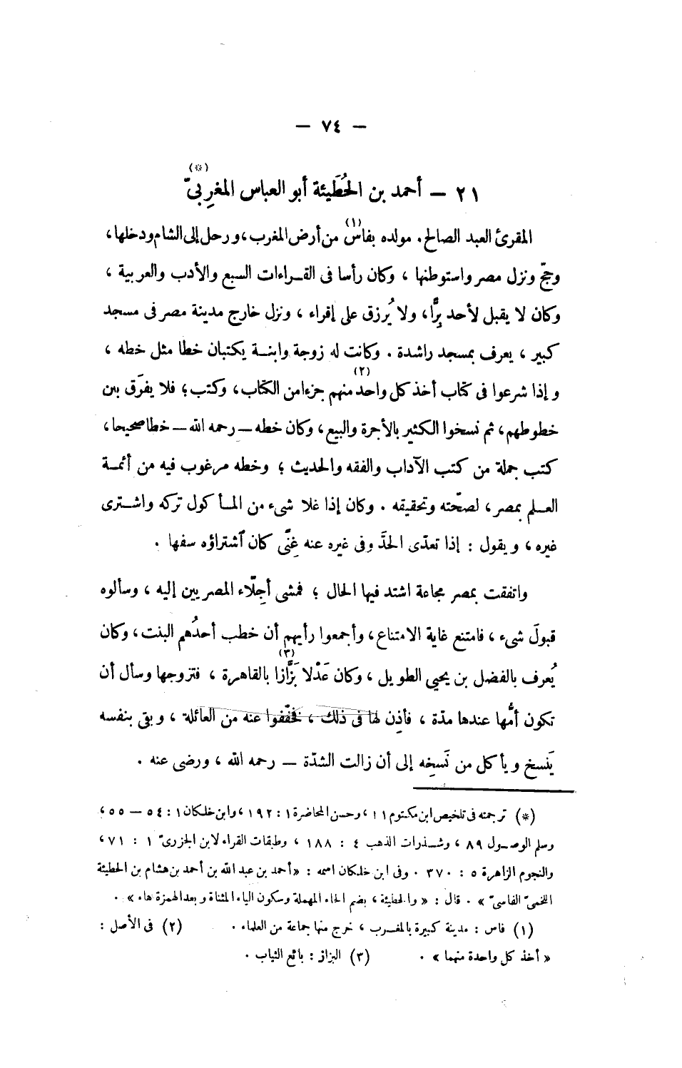 [1]. ترجمته فى تلخيص ابن مكتوم 11، وحسن المحاضرة 1: 192، وابن خلكان 1: 54 - 55، وسلم الوصول 89، وشذرات الذهب 4: 188، وطبقات القراء لابن الجزرىّ 1: 71، والنجوم الزاهرة 5: 370. وفى ابن خلكان اسمه: «أحمد بن عبد الله بن أحمد بن هشام بن الحطيئة اللخمىّ الفاسىّ». قال: «والحطيئة، بضم الحاء المهملة وسكون الياء المثناة وبعد الهمزة هاء».