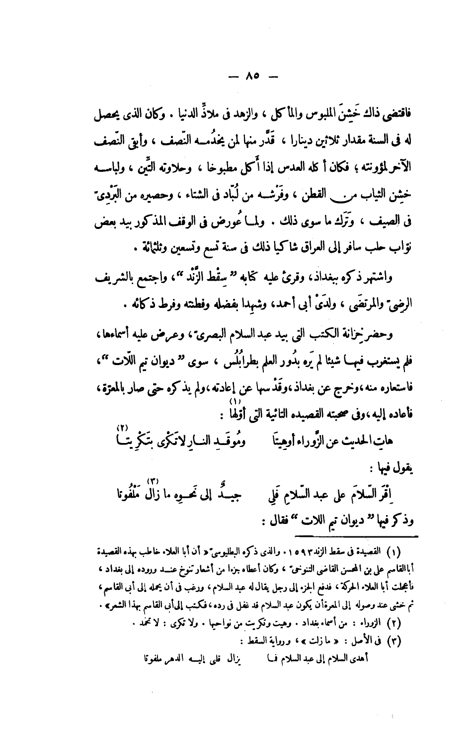 وحضر خزانة الكتب التى بيد عبد السلام البصرىّ، وعرض عليه أسماءها، فلم يستغرب فيها شيئا لم يره بدور العلم بطرابلس، سوى ديوان تيم اللّات، فاستعاره منه، وخرج عن بغداذ، وقد سها عن إعادته، ولم يذكره حتى صار بالمعرّة، فأعاده إليه، وفى صحبته القصيده التائية التى أوّلها «1»: