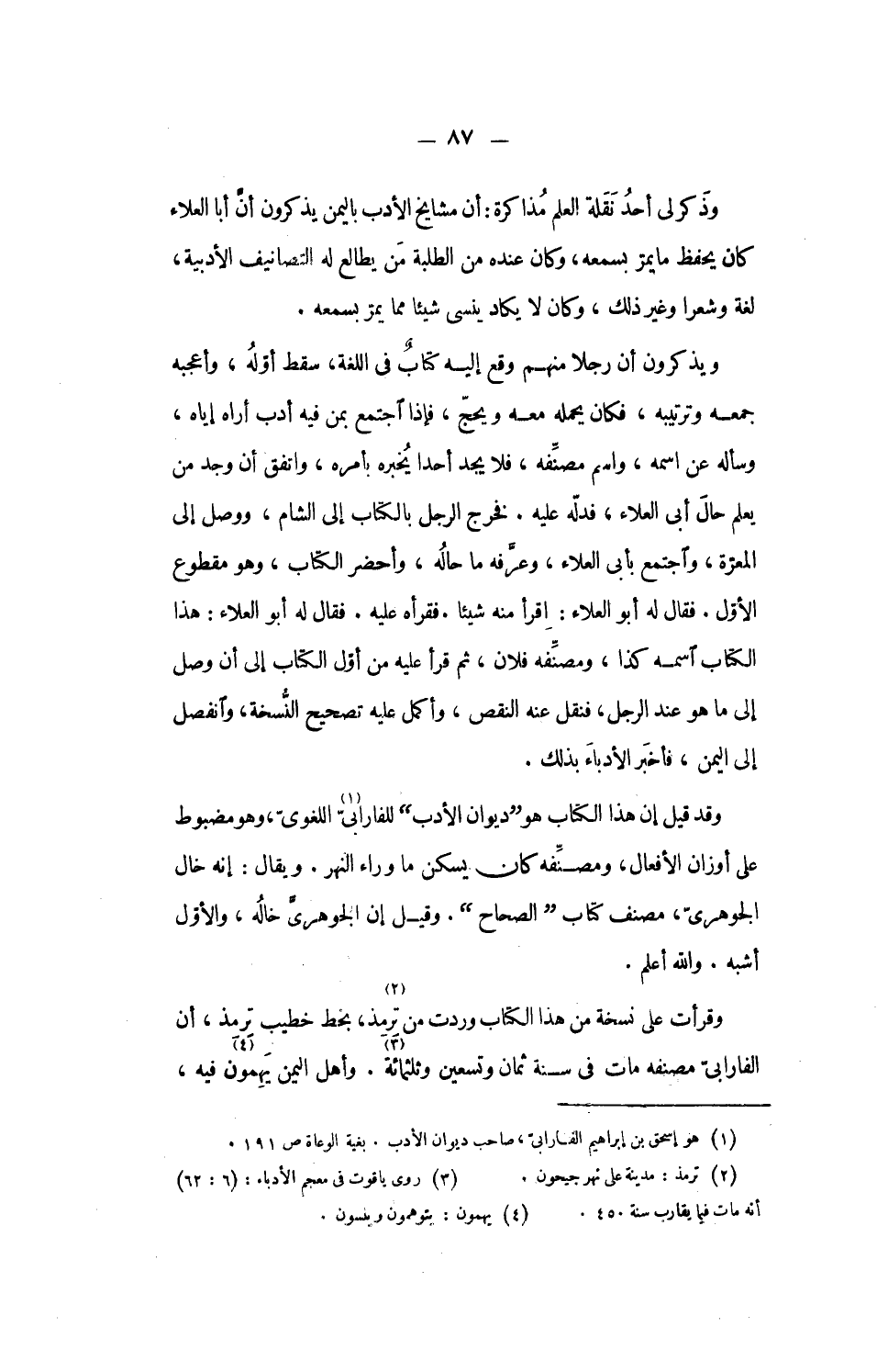 وقرأت على نسخة من هذا الكتاب وردت من ترمذ، «2» بخط خطيب ترمذ، أن الفارابىّ مصنفه مات فى سنة ثمان وتسعين وثلاثمائة «3». وأهل اليمن يهمون «4» فيه،