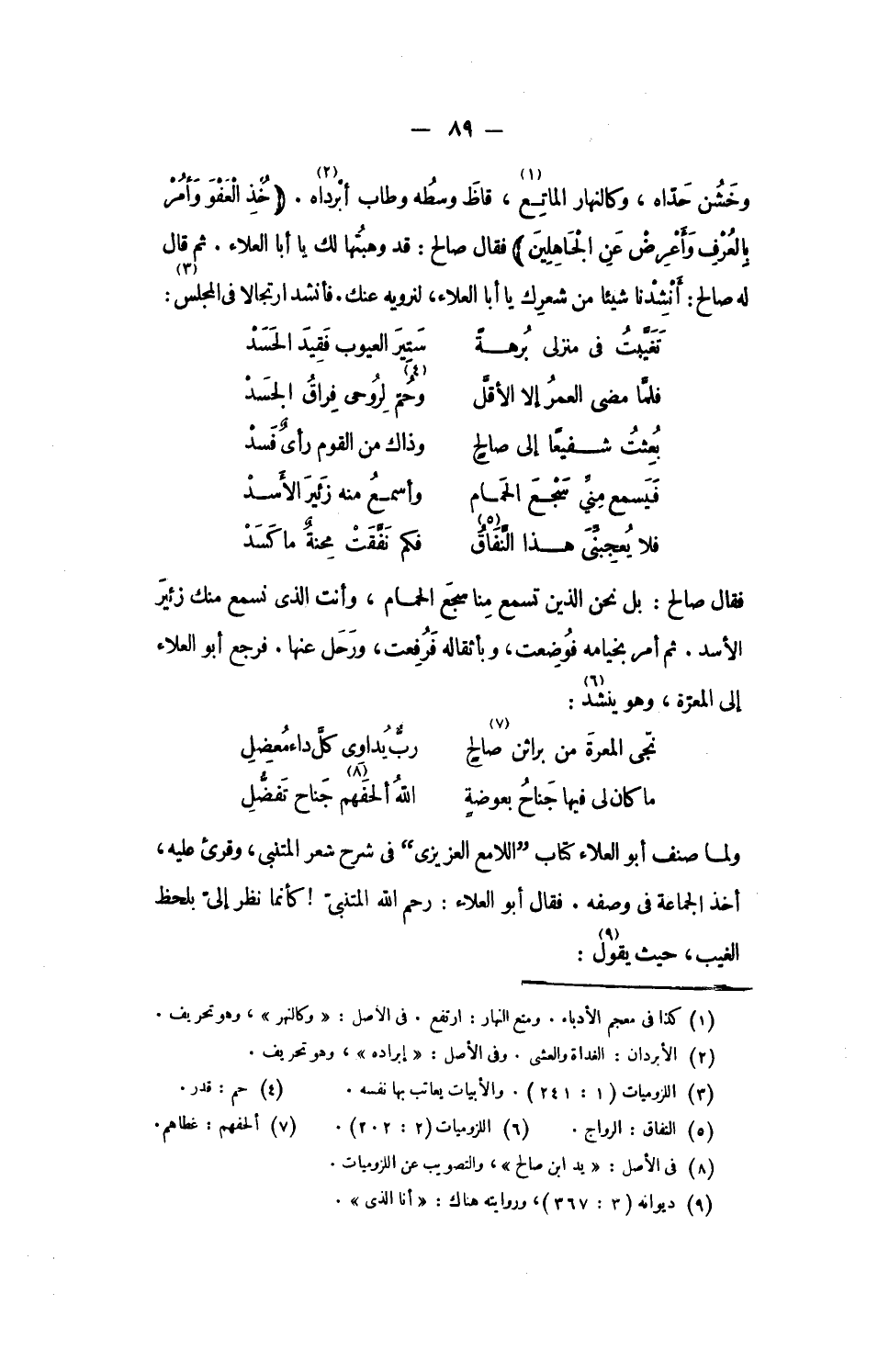 فقال صالح: قد وهبتها لك يا أبا العلاء. ثم قال له صالح: أنشدنا شيئا من شعرك يا أبا العلاء، لنرويه عنك. فأنشد ارتجالا فى المجلس: «3»