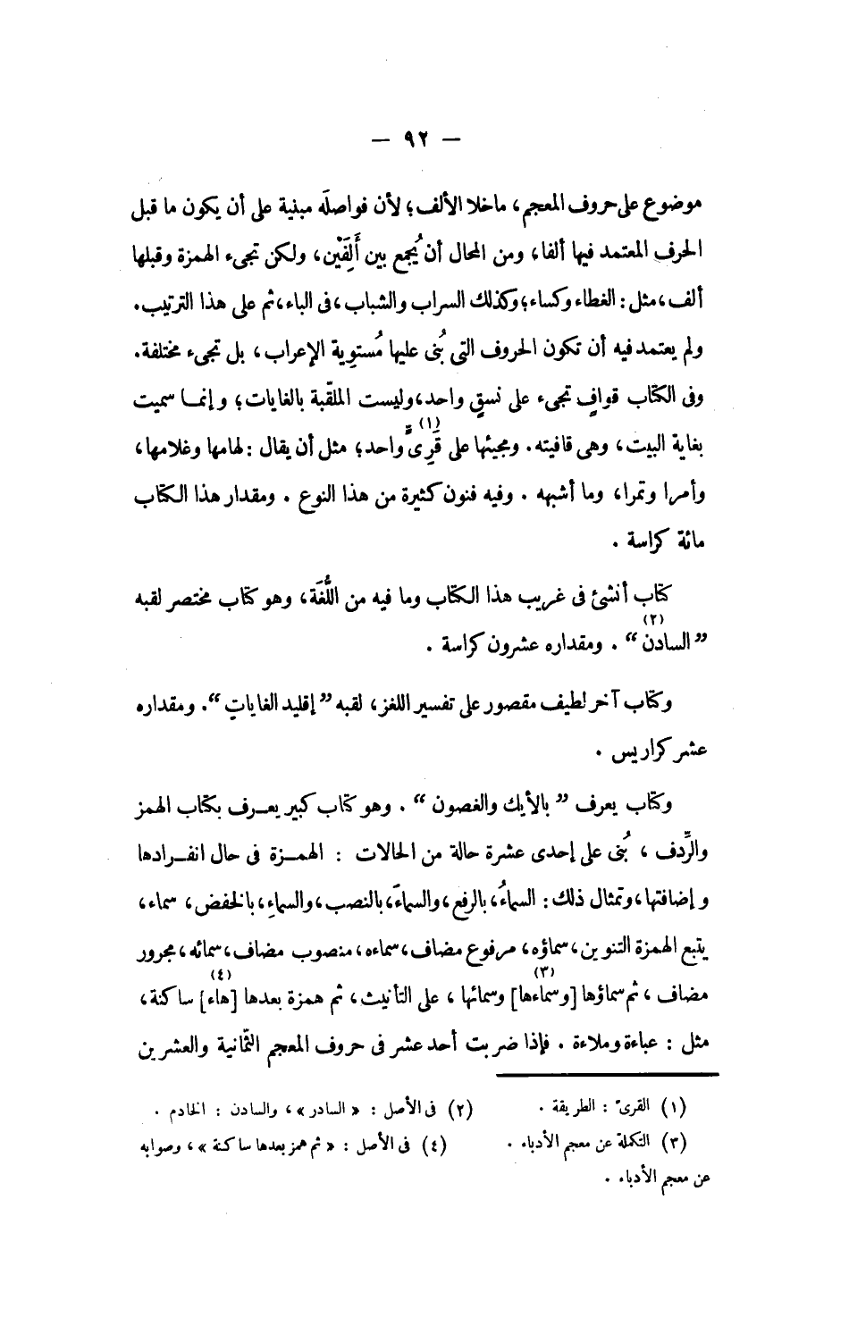 وكتاب يعرف بالأيك والغصون. وهو كتاب كبير يعرف بكتاب الهمز والرّدف، بنى على إحدى عشرة حالة من الحالات: الهمزة فى حال انفرادها وإضافتها، وتمثال ذلك: السماء، بالرفع، والسماء، بالنصب، والسماء، بالخفض، سماء، يتبع الهمزة التنوين، سماؤه، مرفوع مضاف، سماءه، منصوب مضاف، سمائه، مجرور مضاف، ثم سماؤها [وسماءها] «3» وسمائها، على التأنيث، ثم همزة بعدها [هاء] «4» ساكنة، مثل: عباءة وملاءة. فإذا ضربت أحد عشر فى حروف المعجم الثّمانية والعشرين