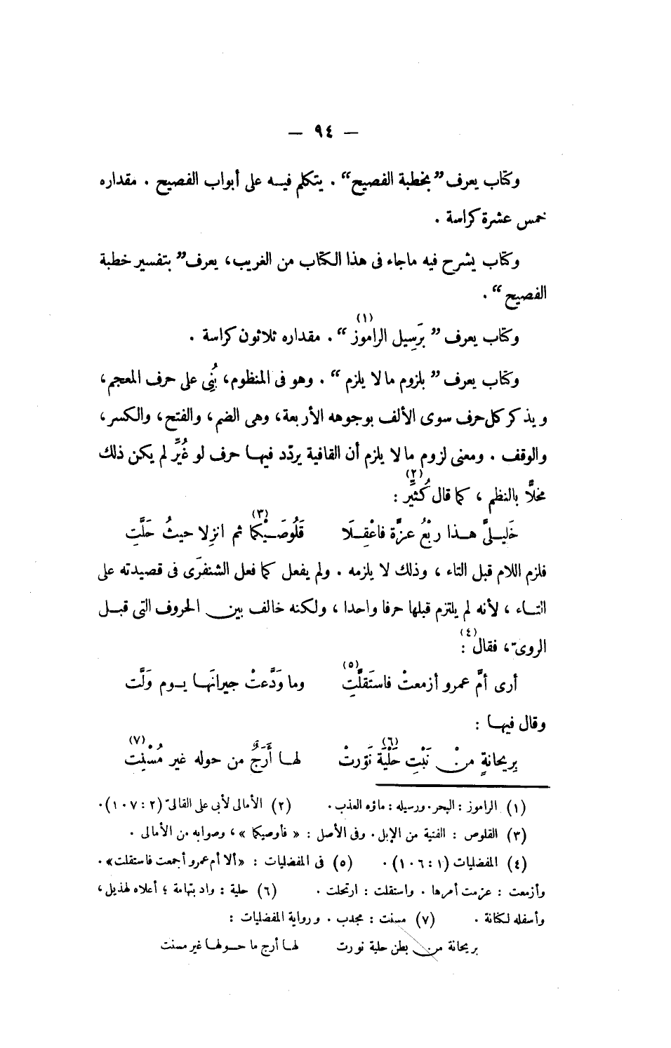 وكتاب يعرف بلزوم ما لا يلزم. وهو فى المنظوم، بنى على حرف المعجم، ويذكر كل حرف سوى الألف بوجوهه الأربعة، وهى الضم، والفتح، والكسر، والوقف. ومعنى لزوم ما لا يلزم أن القافية يردّد فيها حرف لو غيّر لم يكن ذلك مخلّا بالنظم، كما قال كثيّر: «2»